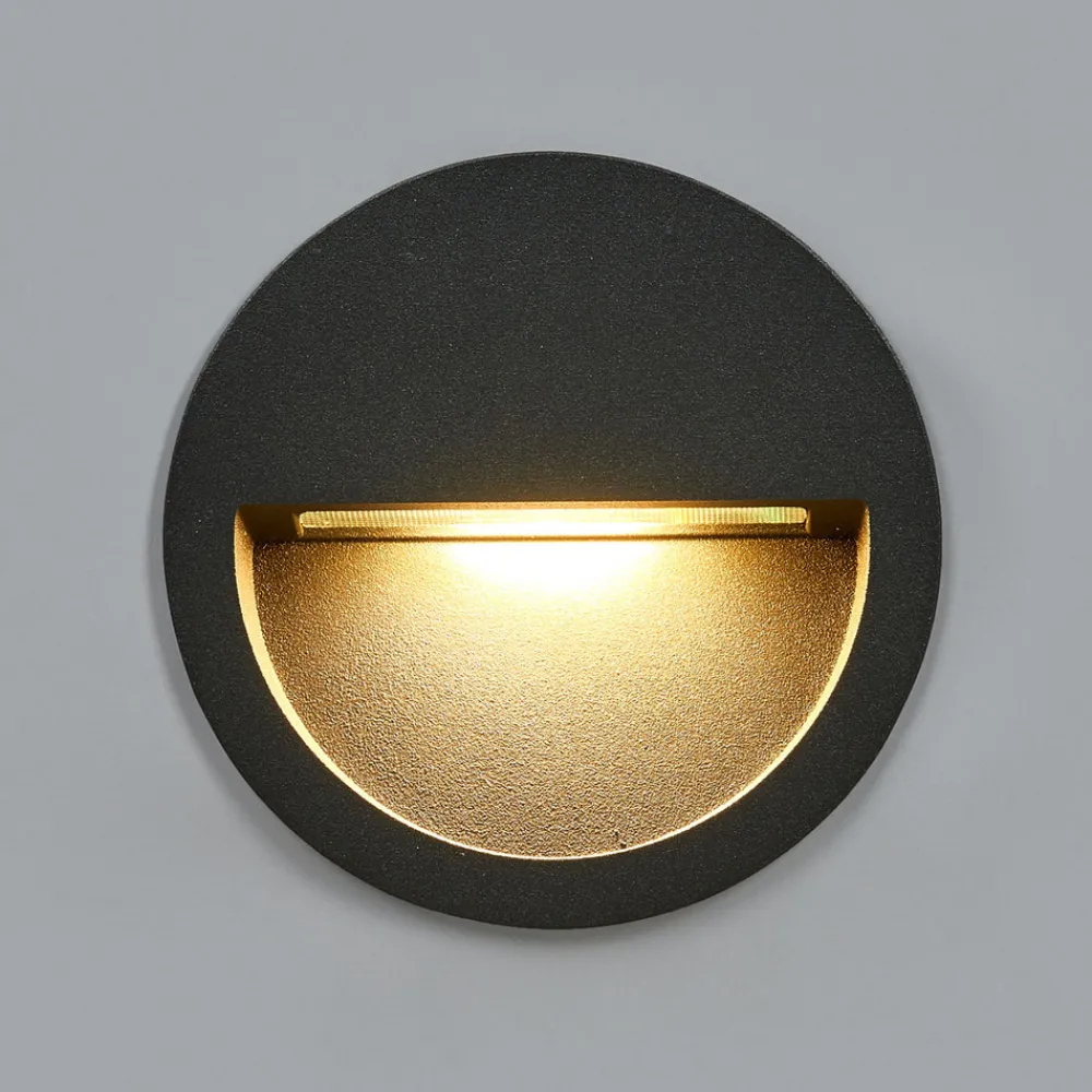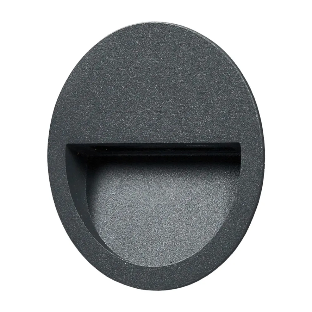 Loya sirkulær LED innfelt vegglampe med mørkegrå overflate Loya har kapslingsgrad IP54 og er designet for utendørs veggmontering, der den gir et attraktivt orienteringslys med en jevn, blendingsfri effekt. LED-lyskilden er innfelt omtrent i midten av den sirkulære lampekroppen og gir en nedadrettet lysstråle. LED-teknologien gir gode energibesparelser, ettersom den nesten ikke bruker strøm, og leveres med en innfelt boks.