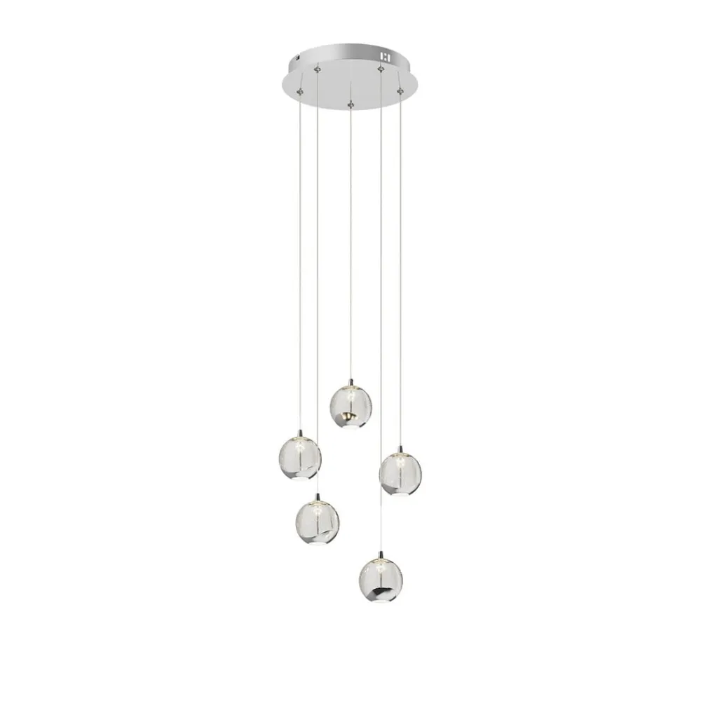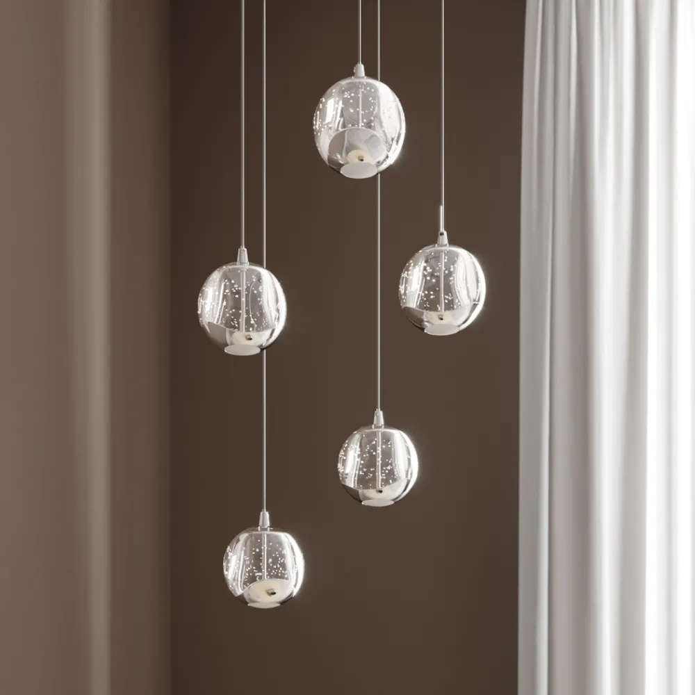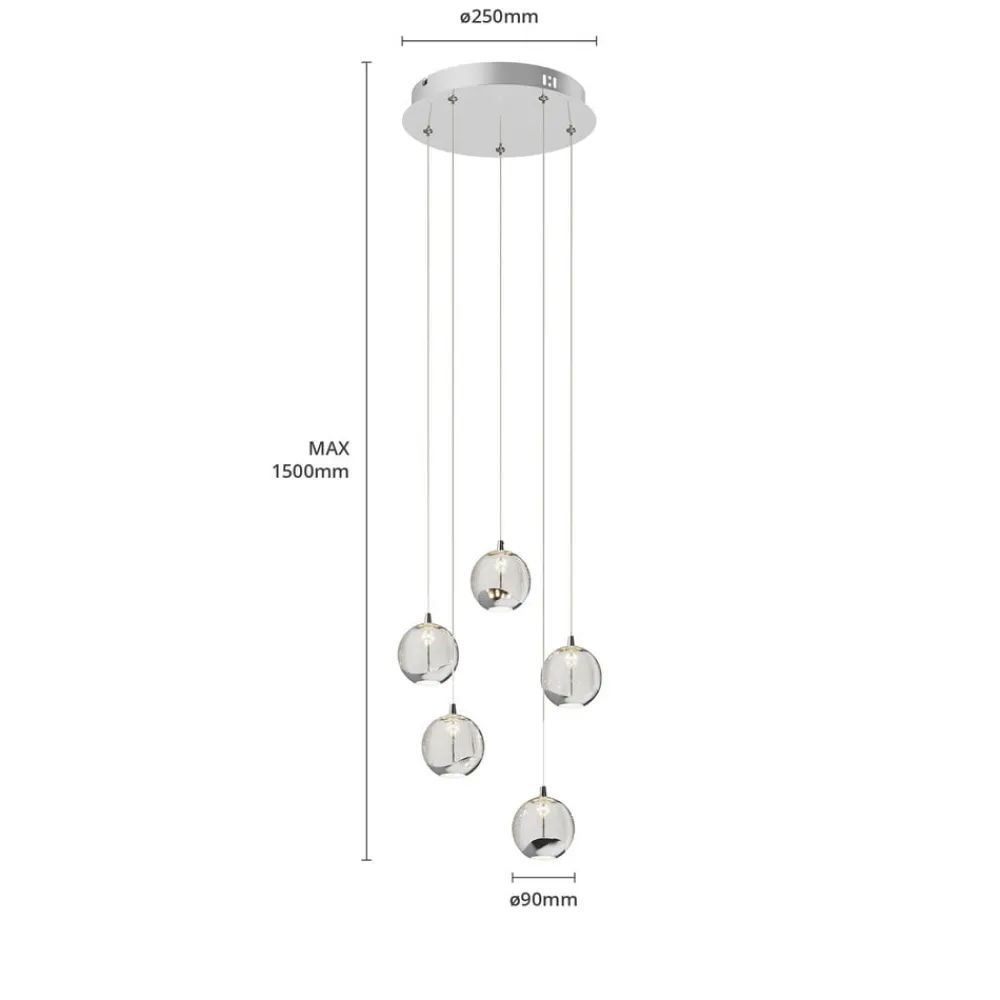 LED-pendellampe med 5 lyskilder med perfekt formede glasskuler og forkrommede detaljer Glasset i de fem kulene er ikke bare klart, men har dekorative luftbobler i strukturen som ikke bare ser ekstravagante ut, men også bidrar til en glamorøs lyseffekt. På undersiden av glasskulene er det også et dekorativt element i skinnende krom, som på en stilfull måte avrunder det totale designet. Lyset avgis direkte og indirekte og er mykt og jevnt på undersiden takket være et hvitt glasselement som forhindrer blending. LED-pendellampens design med effektive LED-lamper gjør den ideell som bordbelysning i oppholdsrommet.