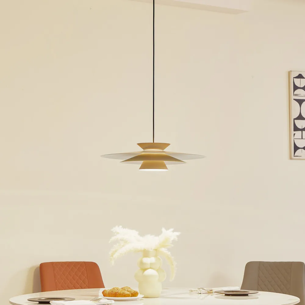 Elegant Livie LED-pendellampe – dimbar for stemningsfull belysning Livie LED-pendellampe kombinerer moderne design med funksjonell belysning og skaper en atmosfære som kan virke både inspirerende og beroligende. Med sin stilrene beigefargede aluminiumsoverflate føyer den seg sømløst inn i moderne og skandinaviske møbleringskonsepter. Den integrerte LED-lyskilden gir energieffektiv belysning i spise- og oppholdsrommet, og en veggbryter gjør at du kan slå lyset av og på som vanlig. Takket være 3-trinns dimmeteknologi med integrert av-funksjon kan den også dimmes til tre ulike lysstyrkenivåer ved å trykke på bryteren flere ganger: 100 %, 40 % og 10 %.
