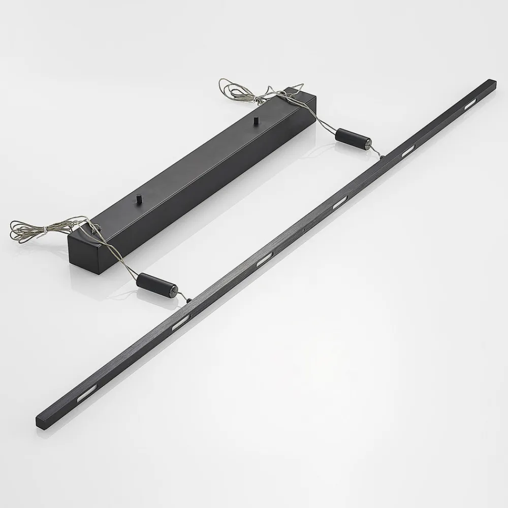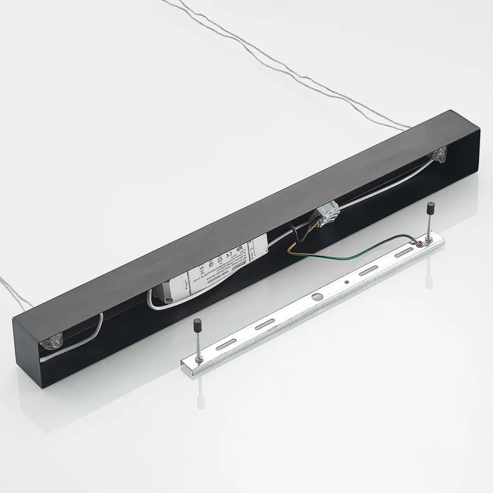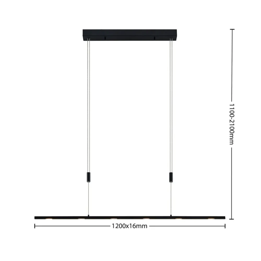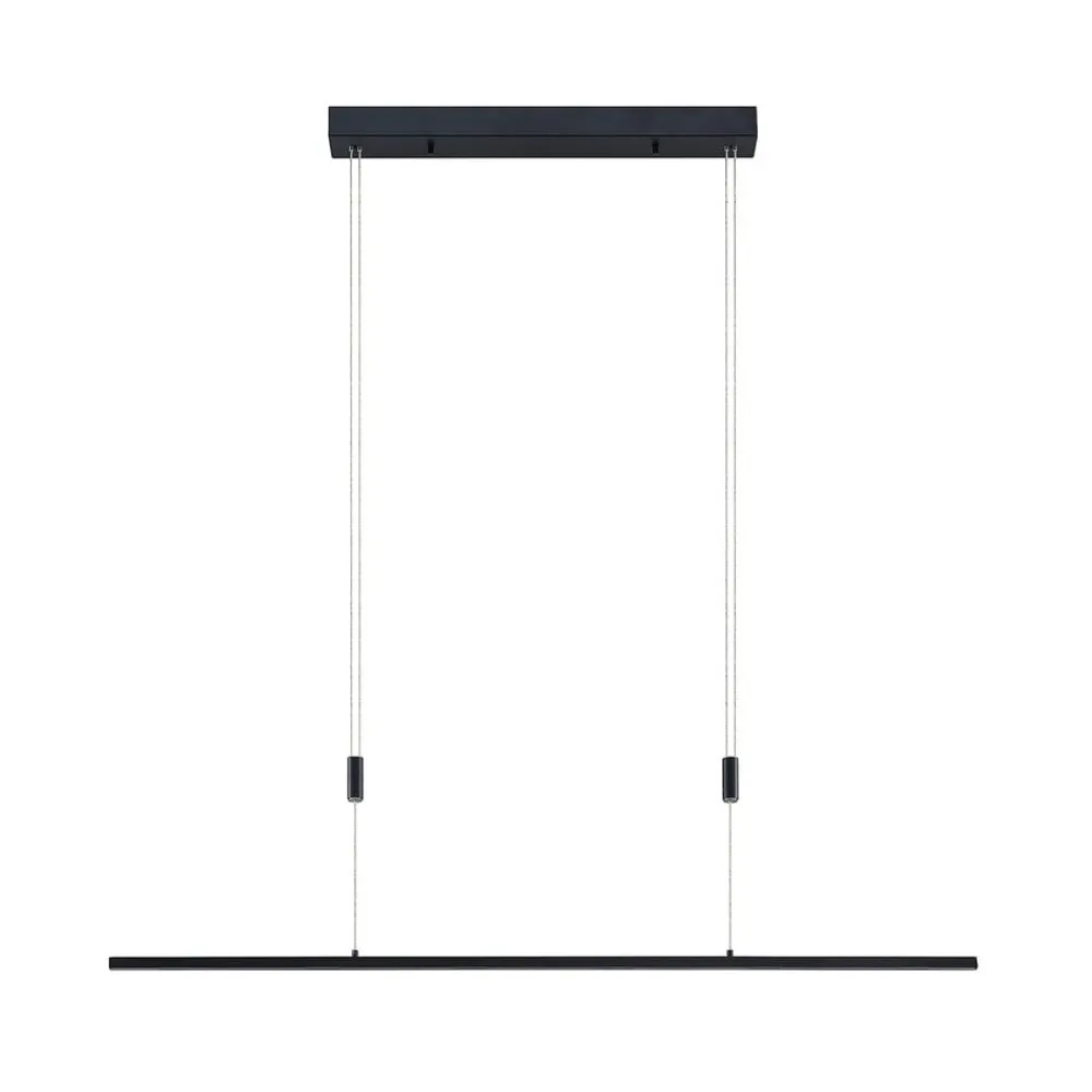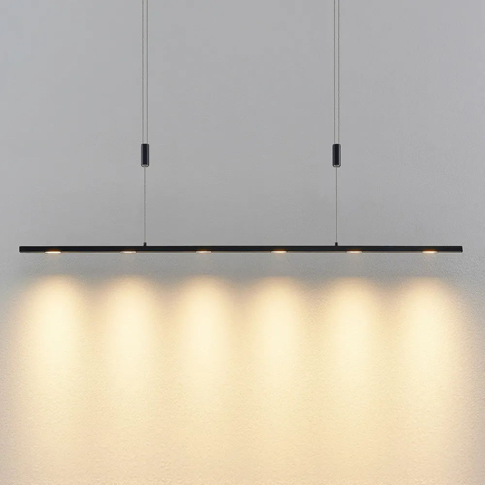 Høydejusterbar Stakato LED-hengelampe i matt svart, 6 lyskilder Stakato LED-hengelampe har en lang og smal skjerm i aluminium, der seks LED-moduler er jevnt fordelt bak akryldeksler. Disse spotlighter et varmhvitt lys nedover, noe som gjør pendellampen til den ideelle lyskilden over spisebordet eller kjøkkenøya i rom med moderne innredning. Lampen imponerer med sin høye grad av funksjonalitet. Ikke bare kan opphengssystemet til det lange lyselementet varieres fra 110 til 210 cm med bare noen få enkle trinn, lysintensiteten kan også stilles inn i tre ulike lysstyrker uten at det er nødvendig å installere en dimmer ved hjelp av den eksisterende lysbryteren. En veggbryter kan brukes til å slå lyset på og av som vanlig. Takket være 3-trinns dimmeteknologi med integrert av-funksjon kan den også stilles inn på tre ulike lysstyrkenivåer (100 %, 50 % og 10 %) ved å trykke på bryteren flere ganger.