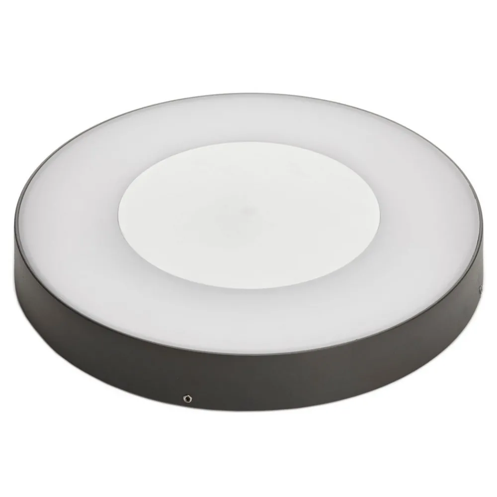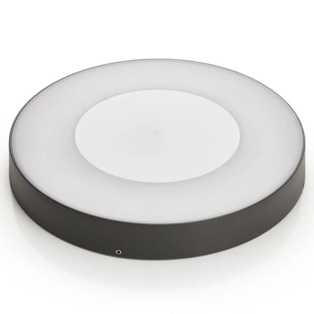 Mørkegrå Sora LED utendørs taklampe med sensor Den elegante Sora LED utendørs taklampe gir også uteområder et klart lys og er enkel å montere på baldakiner. En intelligent sensor, moderne design og robuste materialer gjør den til en harmonisk belysningsløsning. Den runde og kompakte lampekroppen i robust, trykkstøpt aluminium kompletteres av en skjerm i polykarbonat. Denne sprer lyset over et stort område. Den moderne armaturen er utstyrt med en bevegelsessensor, som også kan brukes til tidsinnstillinger og andre justeringer. 360° registreringsvinkel – Justerbar lysvarighet (5-30 min) – Rekkevidde 12 m x 6 m – Slagfasthetsklasse IK08