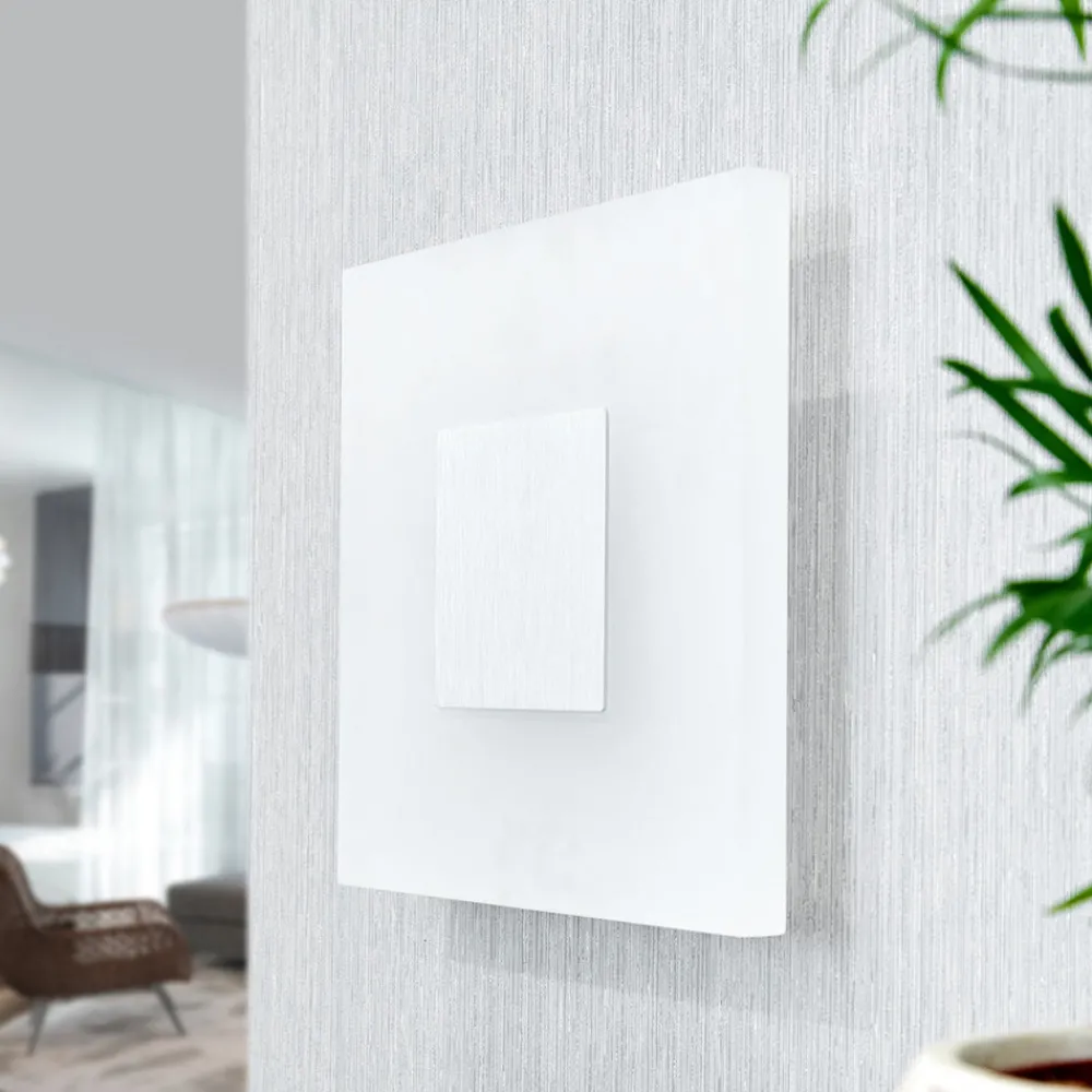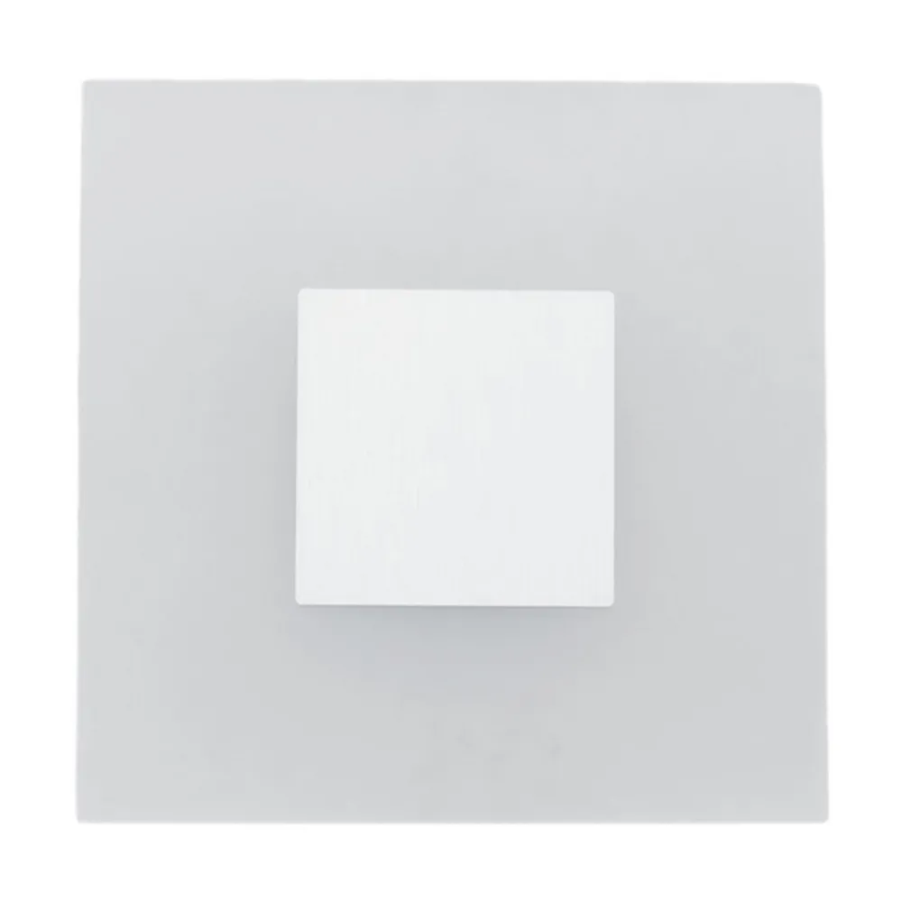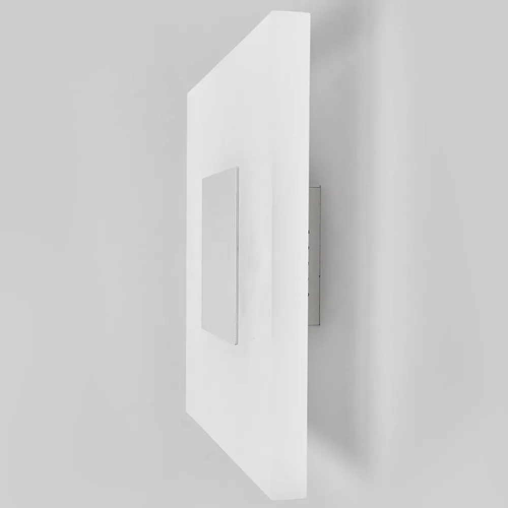 Berlind kantet LED-vegglampe med hvit, satinert akrylskjerm og nikkelfarget firkant i midten Berlind er et belysningsobjekt som enkelt kan integreres i moderne oppholdsrom. LED-vegglampen har en kvadratisk grunnform og er laget av hvit akryl, som suppleres av et nikkelfarget metalldeksel i midten. Lyset er mykt og blendfritt, noe som skaper en spesielt koselig atmosfære. Armaturen egner seg derfor svært godt som aksent- og tilleggsbelysning, og passer like godt i gang, stue og soverom.