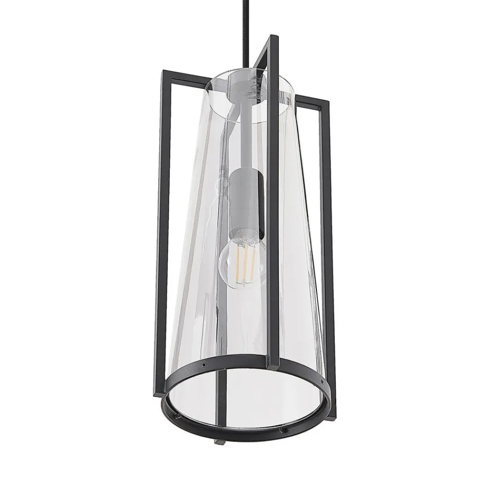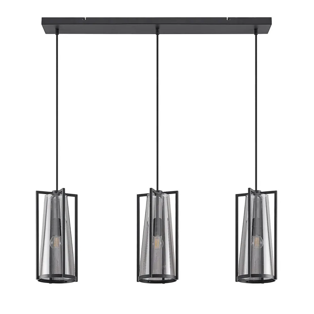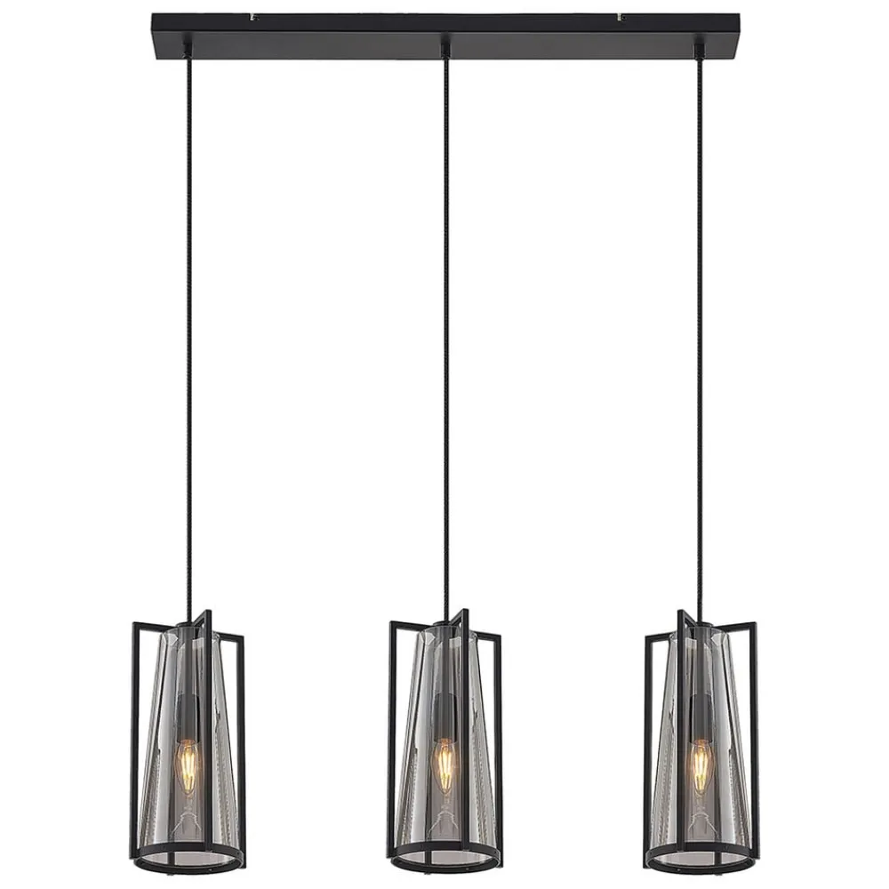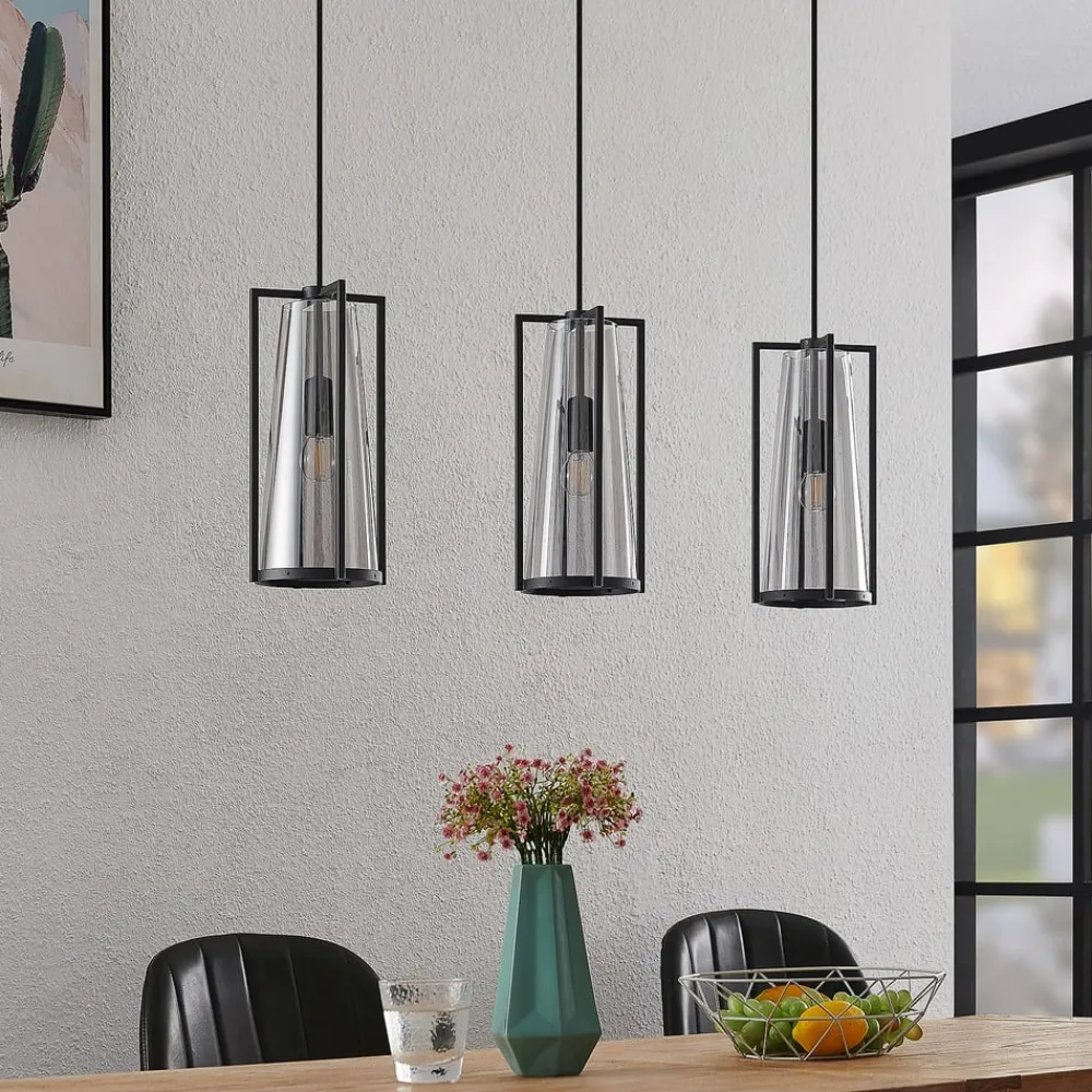 Rufina langstrakt, 3 lyskilder i røkt glass Pendellampe med eksklusiv design Rufina har tre lampeskjermer i en langstrakt form og består av både en firedelt metallramme i svart og en kjegle i røkt glass som danner skjermen. Det røkte glasset skaper en mild blending av lyset, som virker lunere med glasset, og fargetonen er både elegant og ekstravagant. Lyskildene er fortsatt godt synlige – i hvert fall når lampene er slått på – og skal derfor matche helhetsuttrykket, slik tilfellet er med filamentpærer som lyser med LED, men som er modellert etter klassiske glødepærer. Med sin langstrakte form og tre lampeskjermer i tilpasset design passer pendellampen godt over en benk eller et spisebord og gir en dekorativ effekt i oppholdsrommet.