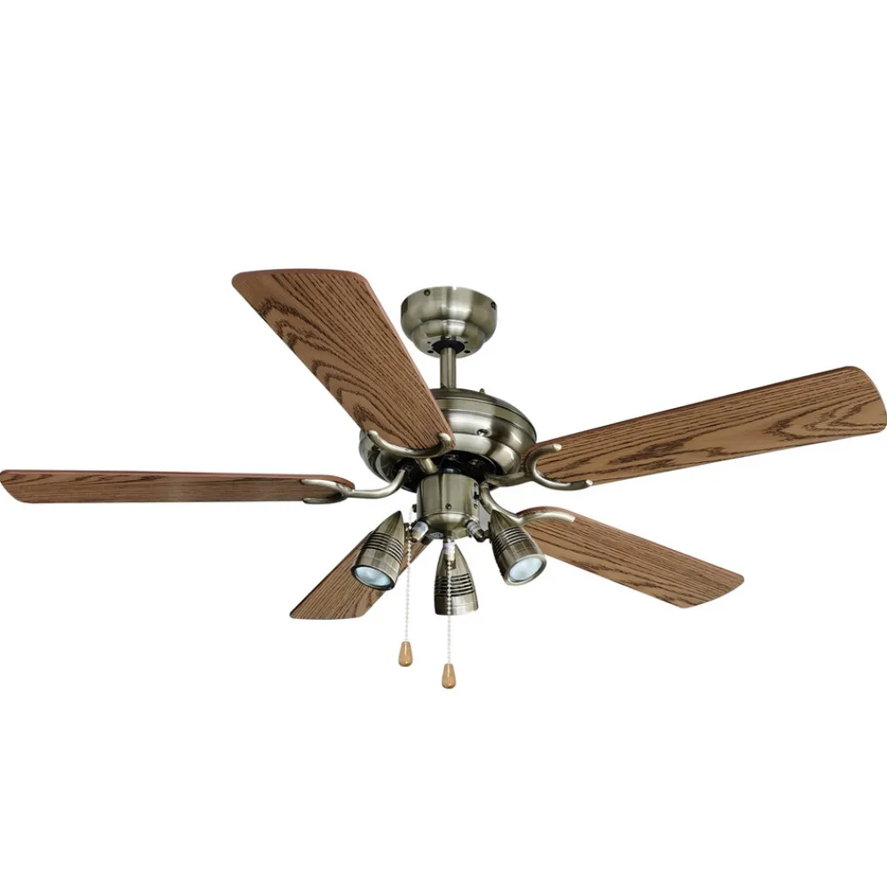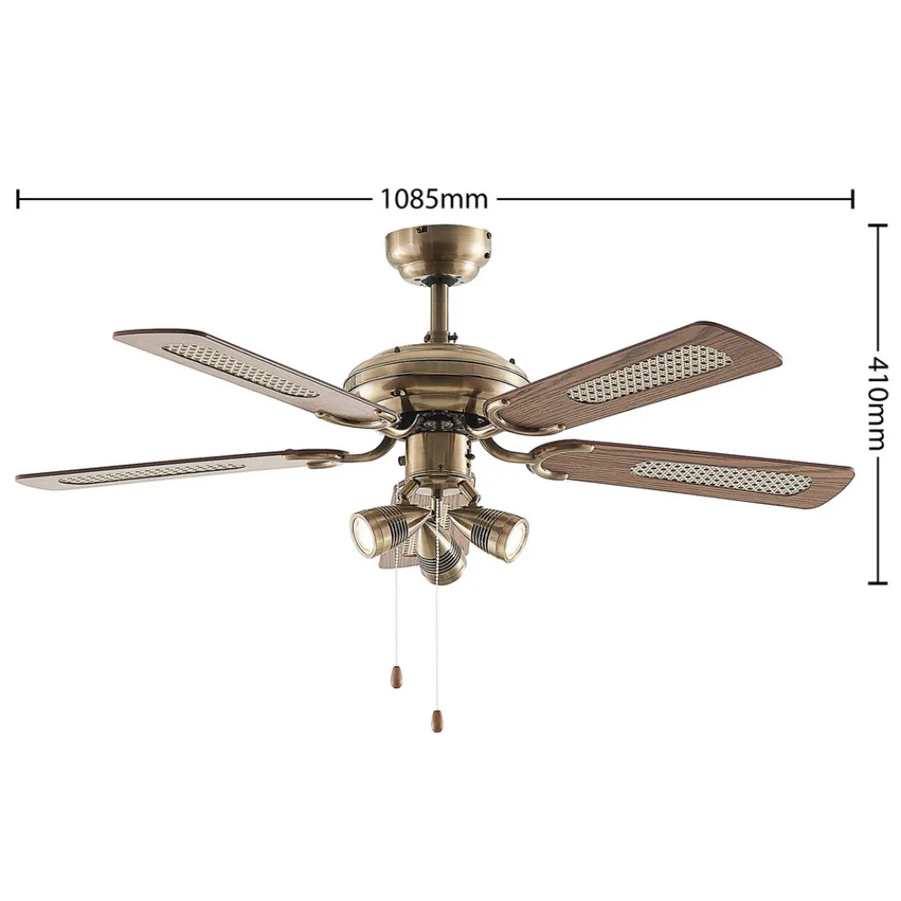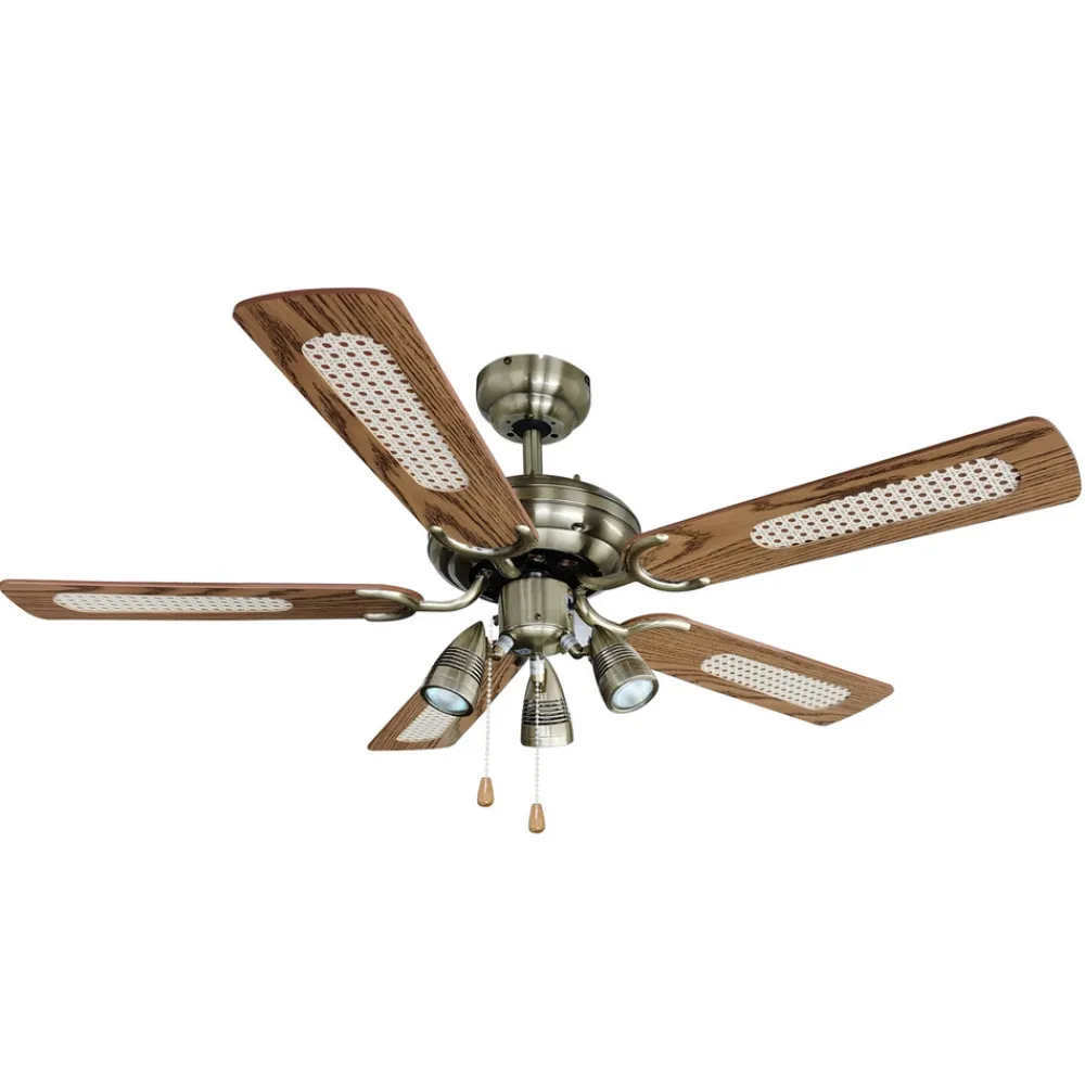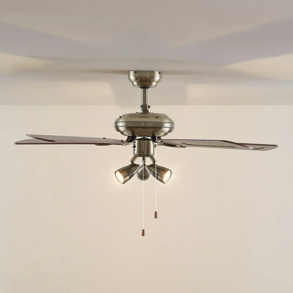 Fargekombinasjonen av messing og mørk eik gjør takviften Anariki til et helt spesielt interiørprodukt. Den har fem vinger og tre fatninger som kan utstyres med passende pærer.