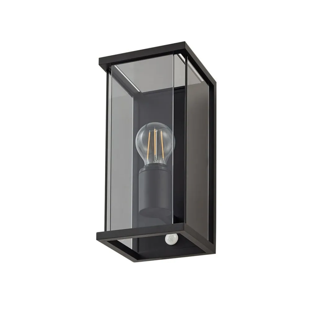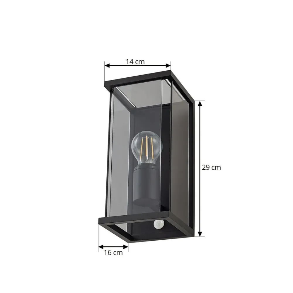 Svart Annalea utendørs vegglampe med røykgrå glasskjerm og bevegelsessensor Annalea utendørs vegglampe kombinerer estetisk eleganse med høy funksjonalitet, og er spesielt designet for bruk på uteområder som uteplasser og balkonger. Den moderne designen i svart finish med røykgrå glasskjerm setter stilfulle aksenter og skaper en innbydende atmosfære. Takket være kapslingsgrad IP54 er lampen beskyttet mot vannsprut og støv, noe som gjør den ideell for utendørs bruk. Annalea har ingen integrert dimmer, men kan enkelt justeres via en ekstern dimmer for å skape ønsket lysstyrke og stemning. Tekniske data Sensor – Tidsinnstilling 5s, 30s, 1min, 3min, 5min, 8min – Lysstyring justerbar 10LUX – 2000LUX – Registreringsområde 6m – Registreringsvinkel 100° – Driftstemperatur -10°C til + 40°C – Luftfuktighet < 93%RH