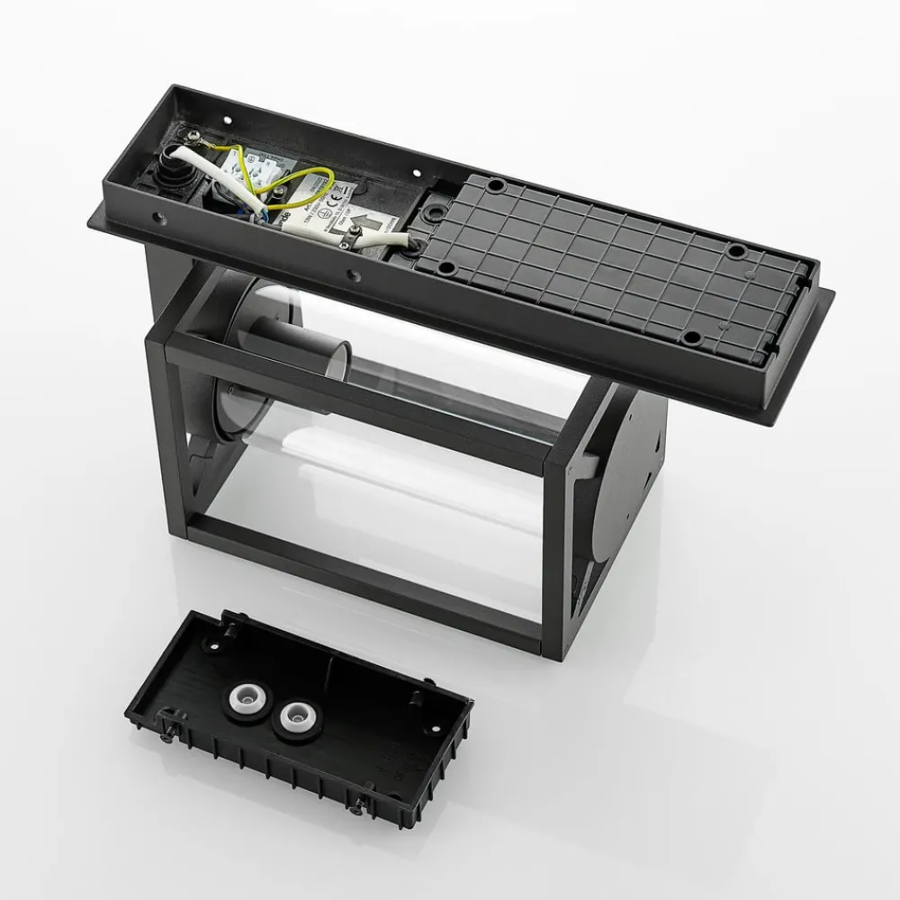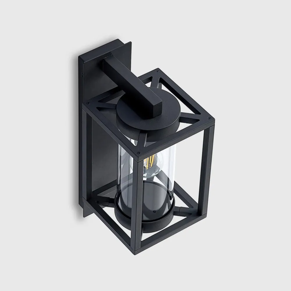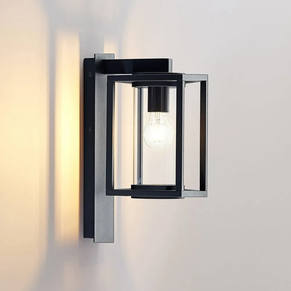 Ferda utendørs vegglampe med glassdiffusor i et praktisk sett med 2 stk Den moderne Ferda utendørs vegglampe er en stilig utelampe som imponerer med sine geometriske former. Utelampens kantete og kantede hus er laget av robust aluminium i mørkegrått og gir fritt utsyn til den sylindriske glassdiffusoren. Pæren som skal brukes, er derfor godt synlig og bør velges med omhu slik at den passer godt inn i den overordnede designen. LED-filamentpærer er ideelle, både visuelt og teknologisk. Armaturen leveres i et sett med 2 stk.