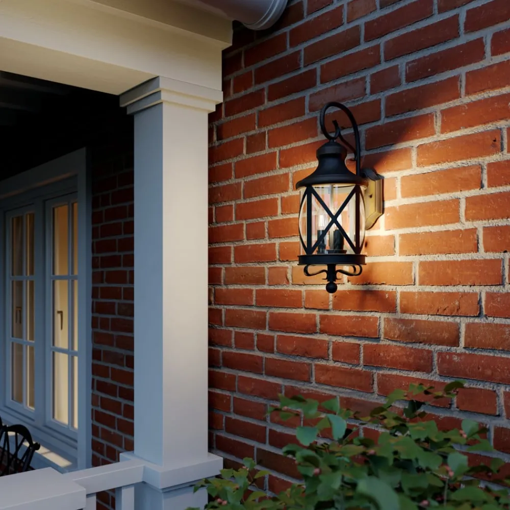 Nostalgisk utseende utendørs vegglampe Marcellino i lyktelook Marcellino passer like godt i rustikke omgivelser som i historiske bygninger, da vegglampen til utendørs bruk utvilsomt har et nostalgisk uttrykk. Skjermen – av metall med klare glassinnsatser – ser ut som en lykt fra tidligere århundrer og utstråler en svært romantisk følelse. De tre fatningene er utstyrt med E14-pærer, som også kan utstyres med energibesparende LED-teknologi. Disse er nå også tilgjengelige i et rustikt utseende, noe som korresponderer veldig godt med det nostalgiske uttrykket. Overflaten på den detaljerte utendørs vegglampen har en rustfinish, noe som stilfullt fullfører helhetsinntrykket.
