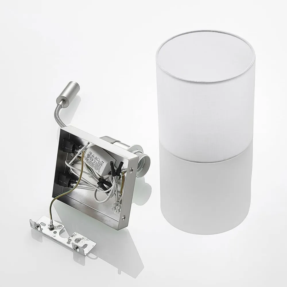 Brinja – moderne vegglampe med fleksibel LED-leselampe og hvit tekstilskjerm Den runde tekstilskjermen i hvitt kompletteres av metall i satengfarget nikkel, noe som gir den moderne vegglampen Brinja en behagelig design. Den har en ekstra LED-leselampe med varmhvit LED, som enkelt kan justeres til alle posisjoner ved hjelp av en fleksibel arm, noe som gir det perfekte lyset for lesing om kvelden. Brinja har en separat bryter for begge lyskildene, slik at hvert lys kan slås av og på etter behov. LED-leselampe: varmhvit (3 000 Kelvin) og 230 lumen