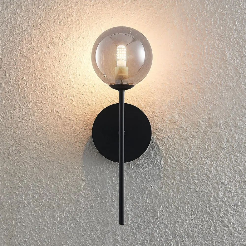 Matt svart vegglampe Wynona med en sfærisk, røykfylt grå glasslampeskjerm i riflet utseende