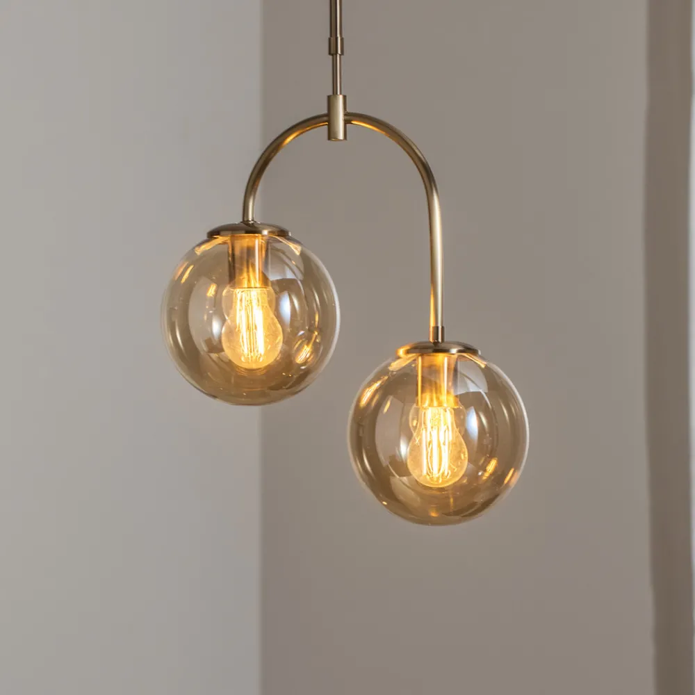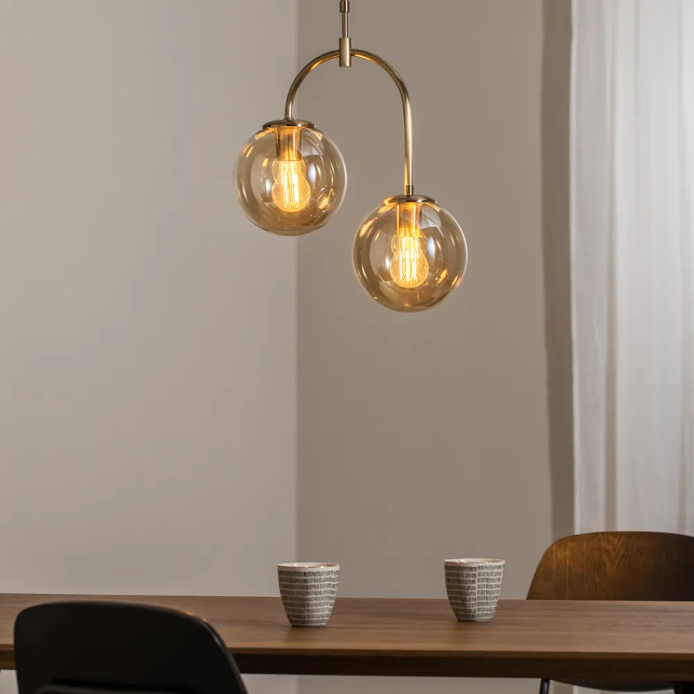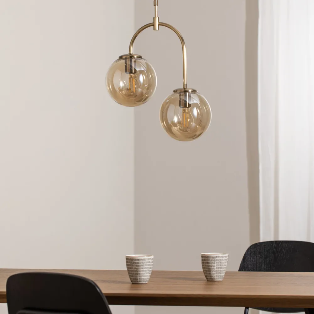 Portemo pendellampe for stue og spisestue Portemo pendellampe kombinerer elegant design med funksjonell belysning og skaper en atmosfære som innbyr til både avslapning og sosialt samvær. Med sin messingfargede finish føyer den seg sømløst inn i stue- og spisestuenes estetikk og blir et blikkfang over ethvert bord eller midtpunkt i rommet. Designet med 2 lyskilder sikrer en jevn lysfordeling, som får et ekstra koselig preg ved bruk av glass. Portemo er et eksempel på hvordan lysdesign ikke bare kan forandre rom, men også stemninger.