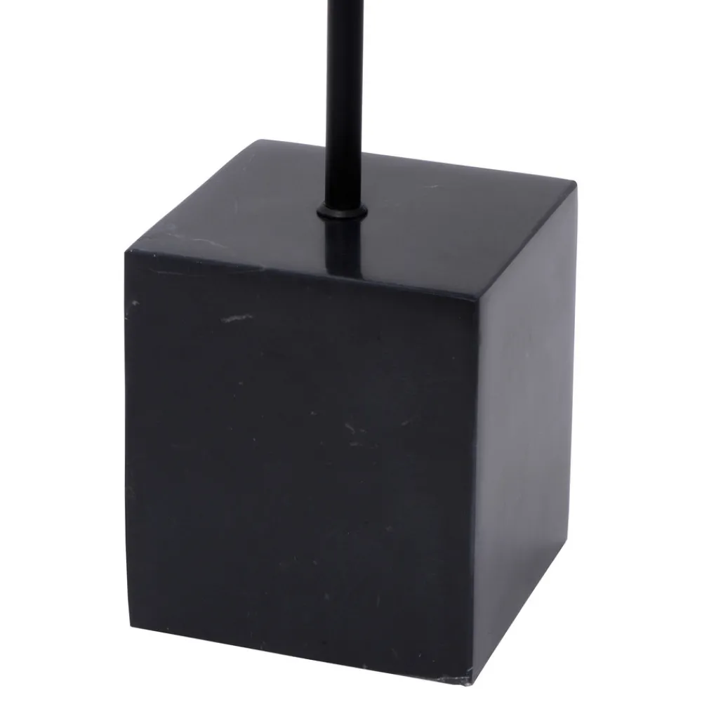 Svart Lorin-gulvlampe med åpen sokkelDen slanke, grasiøse stålrammen på den svarte Lorin-gulvlampen troner på en kantet, solid sokkel av marmor, som gir lampen en spesiell detalj med sin delikate marmorering. En lampeskjerm er helt utelatt. På grunn av den åpne designen anbefales det å velge en dekorativ lyskilde som gir Lorin det lille ekstra.