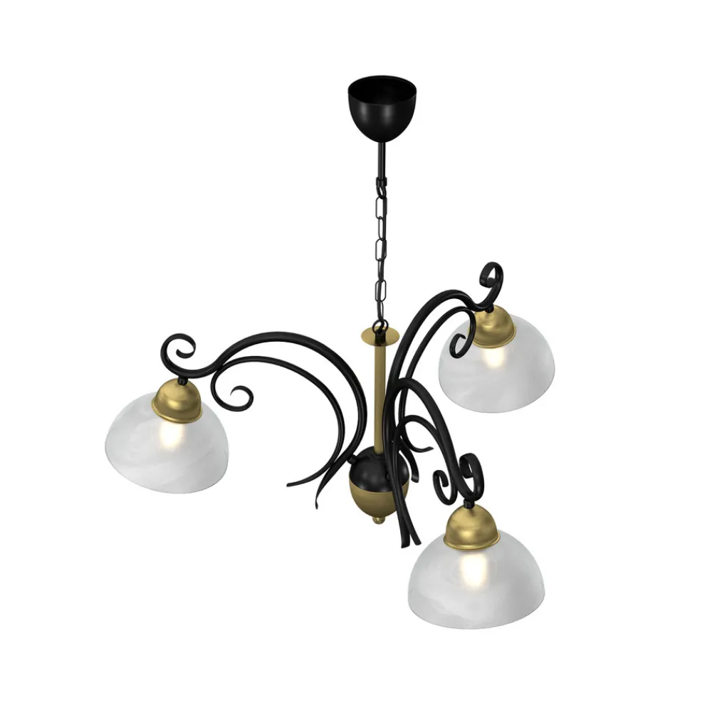 Lysekrone Flora kombinerer rustikk sjarm med tidløs eleganse og blir dermed et høydepunkt i enhver stue eller spisestue. Den er laget av høykvalitets stål og glass og imponerer med sine satinerte, svartmessingfargede detaljer, som gir ethvert rom et spesielt preg. De tre kunstnerisk utformede glasskjermene sørger for en jevn og behagelig lysfordeling som passer både til koselige kvelder og inspirerende øyeblikk.