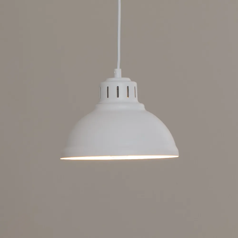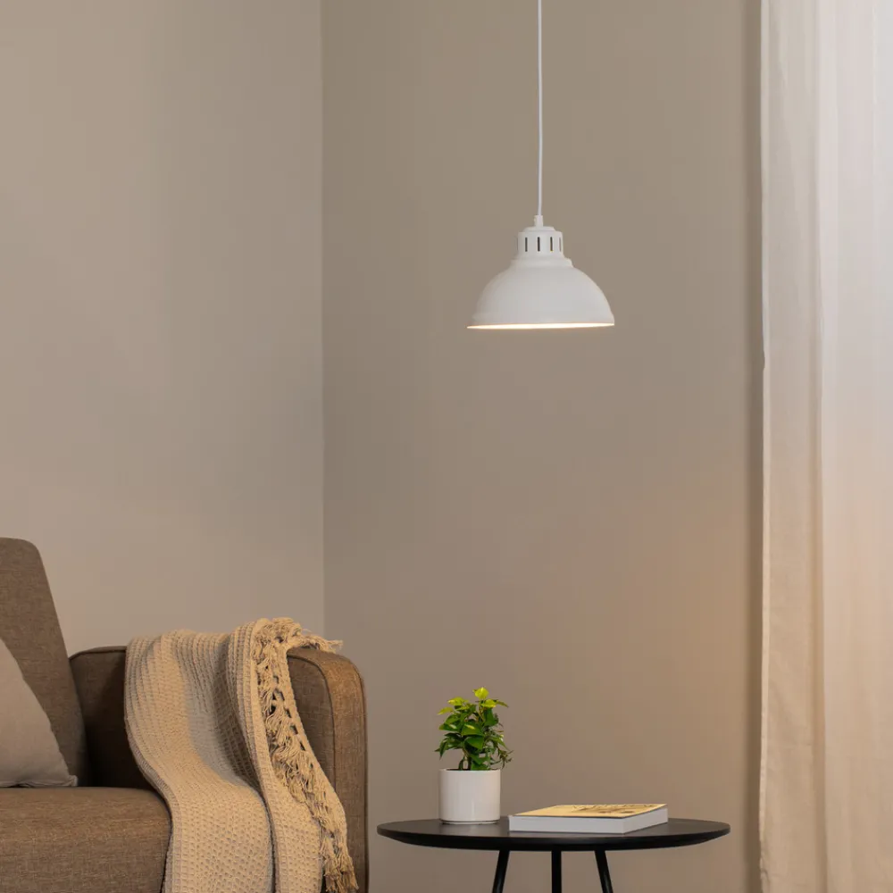 Sven hengelampe i hvitt: industriell sjarm til spisestuen og kjøkkenet Sven hengelampe, som er produsert i Europa, passer inn i mange rom med sin industrielle design – for eksempel på kjøkkenet eller i spisestuen. Den 1 lyskilde-armaturen i hvitt, laget av robust stål, er ideell til å belyse bord eller benker, enten enkeltvis eller som en del av flere armaturer. Belysningen kan også dimmes ved å velge dimbare lyskilder (medfølger ikke) og i kombinasjon med en ekstern dimmer.