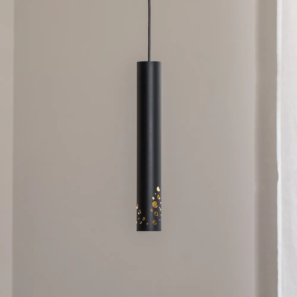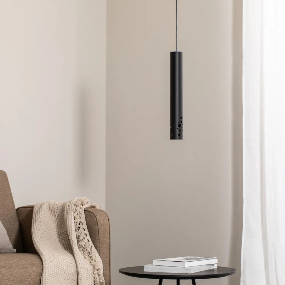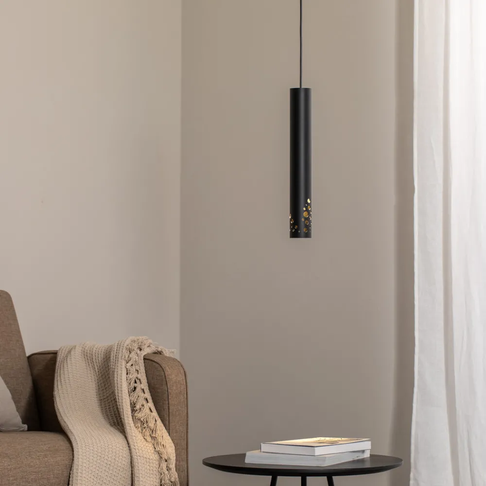 Lyskunst til hjemmet: Tibia pendellampe Tibia pendellampe imponerer med sin sylinderformede, slanke skjerm av stål, som har et slående perforert mønster i bunnen. Dette skaper en spesielt vakker lyseffekt. Tibia hengelampe er mer enn bare en lyskilde; den er et designelement som i betydelig grad påvirker atmosfæren i et rom. I skjermen er det innebygd en GU10-fatning, som kan utstyres med en LED-pære etter eget valg (maks. 8 W LED) – produsert i Europa