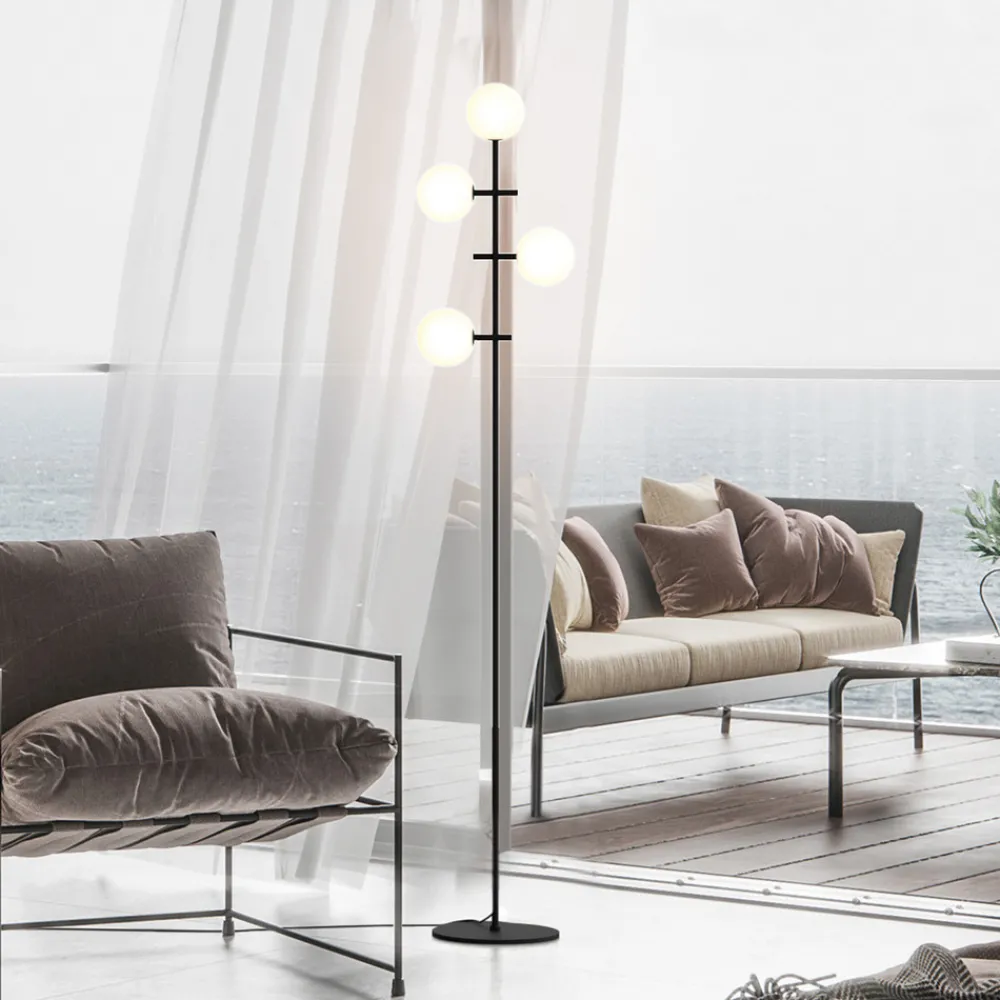4 lyskilder Cellar gulvlampe i svart med hvite sfæriske glasskjermer Funksjonalitet og tiltalende design er kombinert i den 4 lyskilder Cellar gulvlampe. De fire kuleformede skjermene i opalhvitt glass er plassert øverst på stativstangen og de små konsollene, noe som sikrer en jevn og blendingsfri lysfordeling. Lampen er utstyrt med standardiserte G4-fatninger, noe som gjør det enkelt å bytte ut LED-lyskilden. G4 LED-pærer med varmhvit lysfarge følger med i leveransen. Konstruksjonen med 4 lyskilder i robust jern i svart utførelse og elegante glasskuler i hvitt skaper en koselig atmosfære i stuen eller på soverommet, og bruken av LED-pærer sørger for energieffektiv belysning av rommet.