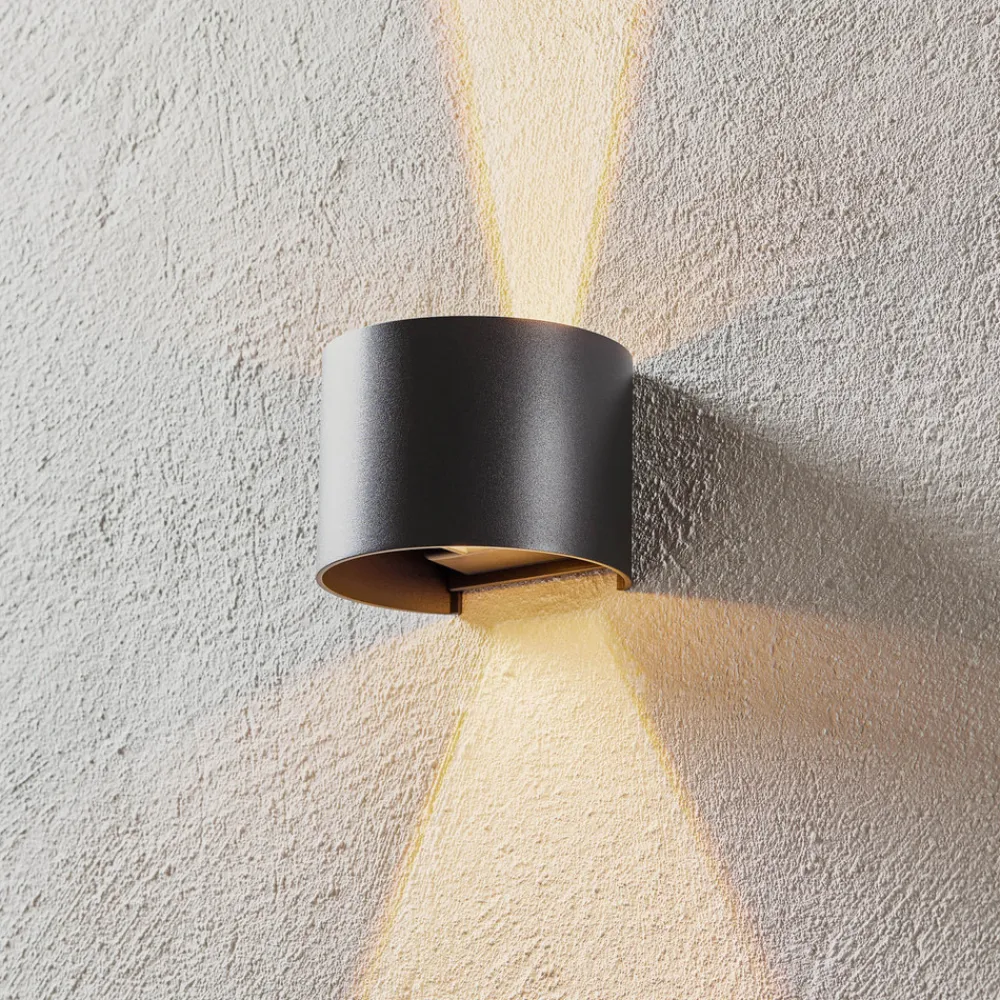 Rund Davos LED-vegglampe med justerbar lysvinkel Den runde Davos LED-vegglampen i aluminium utmerker seg ikke bare med sin energieffektive belysning, men også med sine unike og justerbare lyseffekter. Armaturens strålevinkler oppover og nedover kan justeres manuelt, slik at du kan velge individuell, bred eller smal lysstråle i begge retninger uavhengig av hverandre. Davos LED utendørs vegglampe er utstyrt med varmhvite LED-er og er beskyttet mot støv og vannsprut med kapslingsklasse IP54.