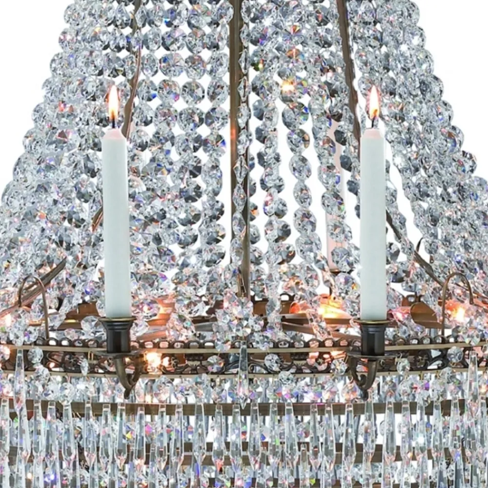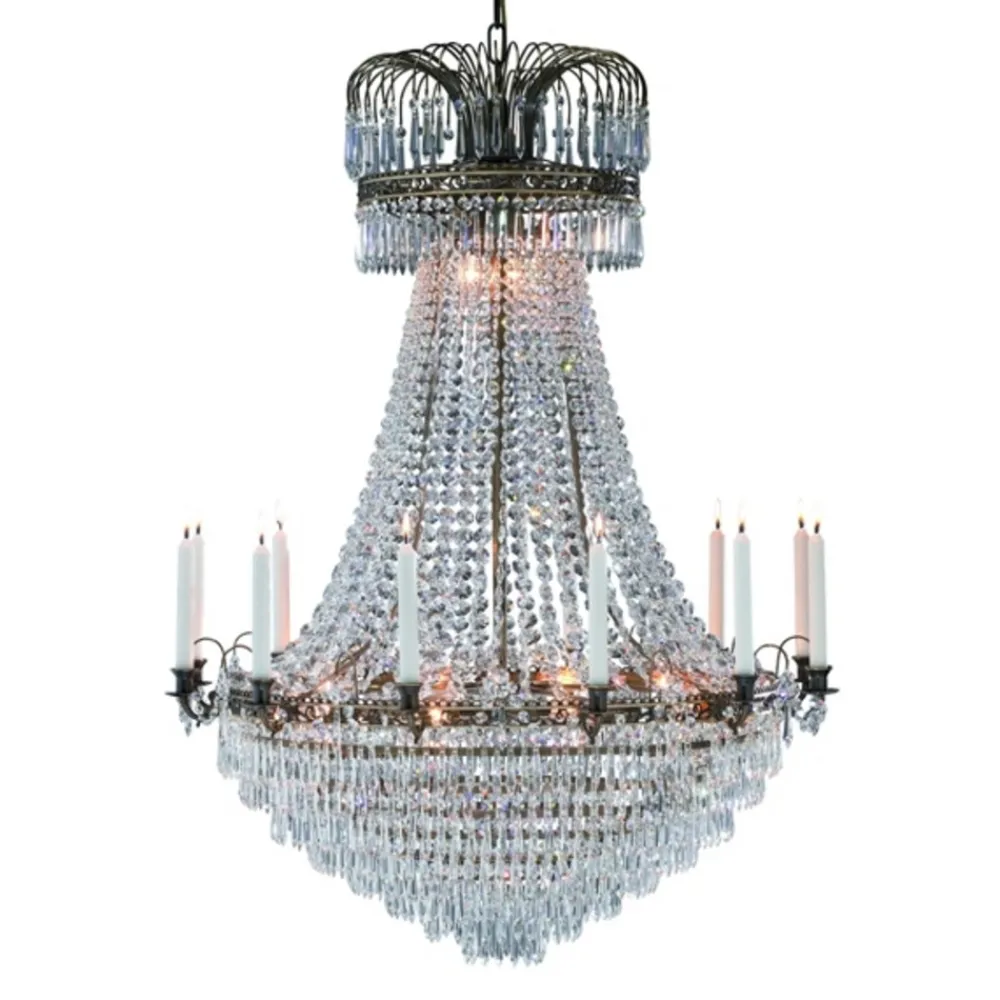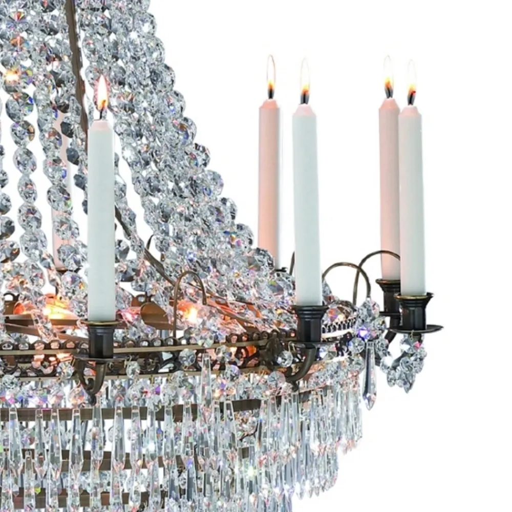 Denne stearinlyslysekronen er et fantastisk smykke. Metallrammen fås i ulike størrelser og står for lampens klassiske design. De mange krystallene gjør lampen enda mer eksklusiv og sørger i tillegg for skinnende belysningseffekter. Lysestakene gjør sitt til at denne lampen er imponerende og passer til slanke lys som sørger for et harmonisk uttrykk. Denne lysekronen er fortryllende også når den er slukket og er et fantastisk blikkfang.