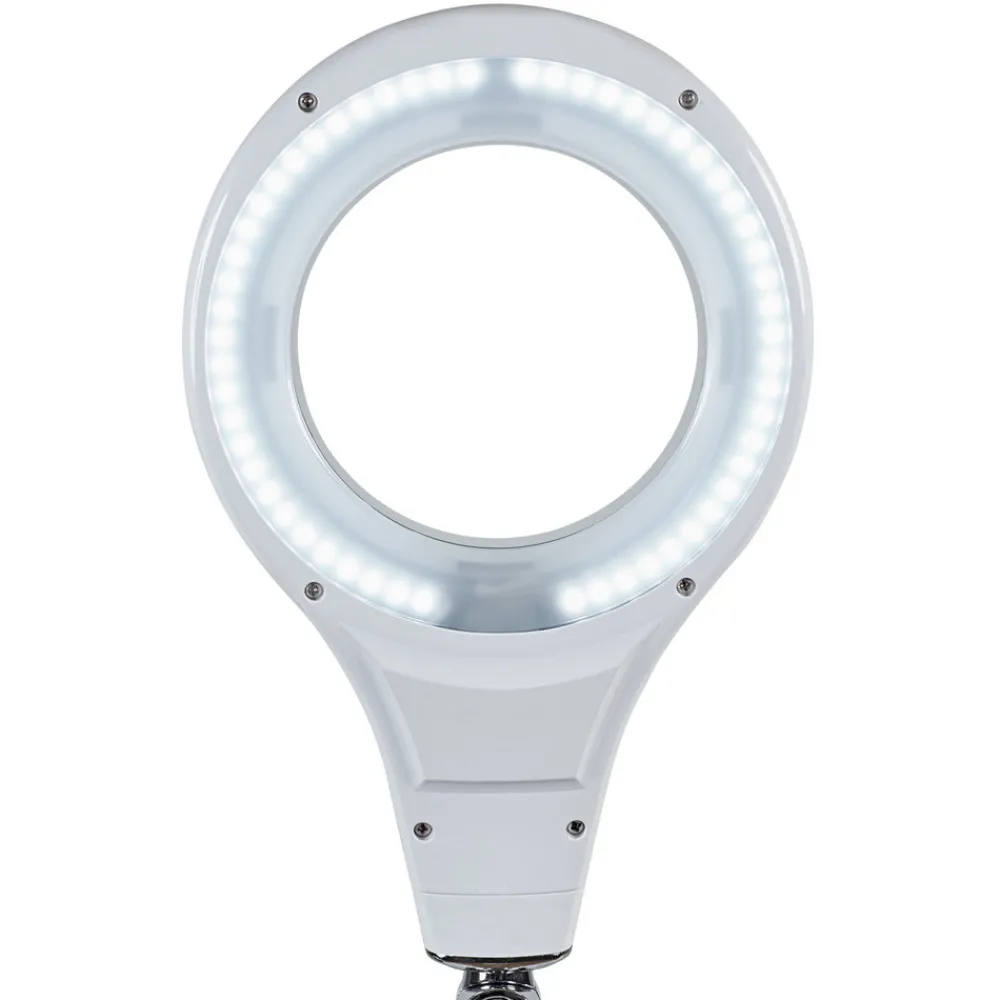 MAULmakro LED-lupelampe med stativ – allsidig MAULmakro LED-lupelampe med sin robuste parallellogramarm og stativ er ideell som en praktisk arbeidslampe for laboratorier, tekniske kontorer, verksteder eller til skrivebordet hjemme. Den er utstyrt med en 3-dioptrisk linse (1,75x forstørrelse, Ø 12,7 cm). Linsearealet er 144 kvadratcentimeter. En beskyttelsesklaff hindrer støv og skadelig sollys. Hodet og armen kan vippes og roteres, slik at innrettingen alltid kan justeres under arbeidet. Lysutslippet er svært homogent takket være de ringformede LED-lampene. Lyset slås av/på med bryteren som er innebygd i hodet – Med diffusor for minimal skyggevirkning – Hodet kan justeres i tre dimensjoner – Null strømforbruk når belysningen er slått av – Belysningsstyrke: 2220 lux på 35 cm avstand