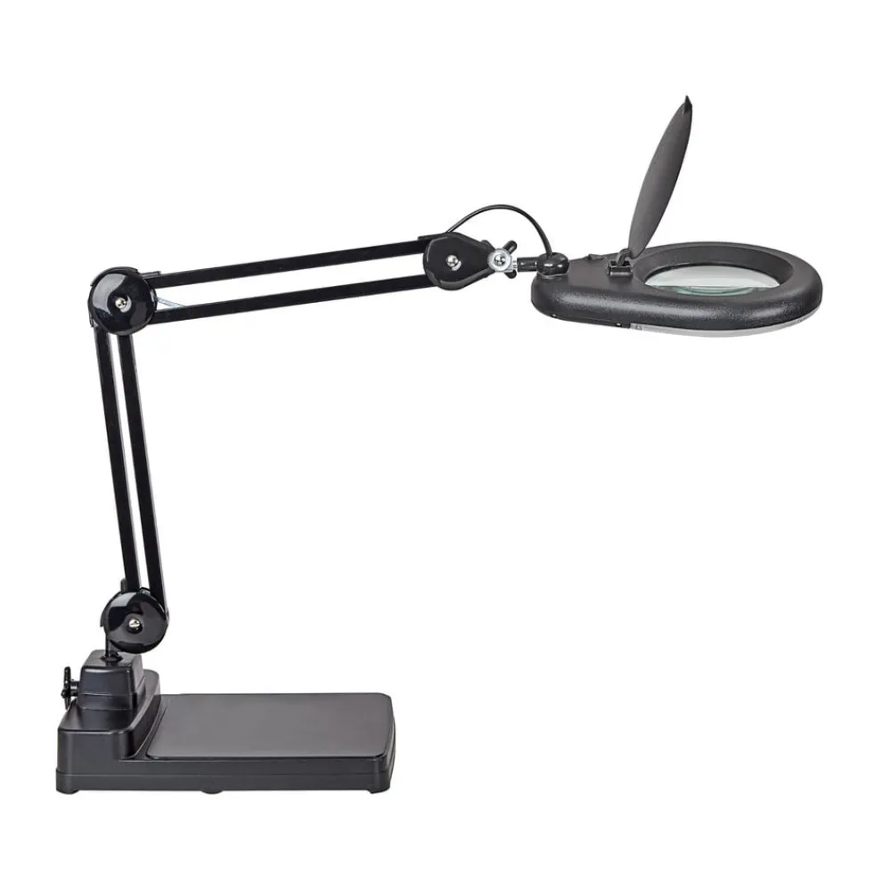 Justerbar LED-lupelampe MAULviso i svart MAULviso er en stabil og solid, svært justerbar luplampe utstyrt med en sterk parallellogramarm i metall og en stabil base med svingbart ledd. Den er ideell for nøyaktig arbeid i laboratorier, verksteder, legekontorer eller for mekanisk presisjonsarbeid i hjemmet. Den integrerte 3-dioptri-linsen i ekte glass forstørrer 1,75x, og de 90 lysdiodene i det ringformede lampehodet gir lys i lysfargen dagslys, som lyser opp arbeidsområdet uten skygger.