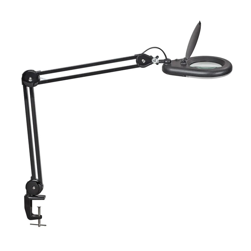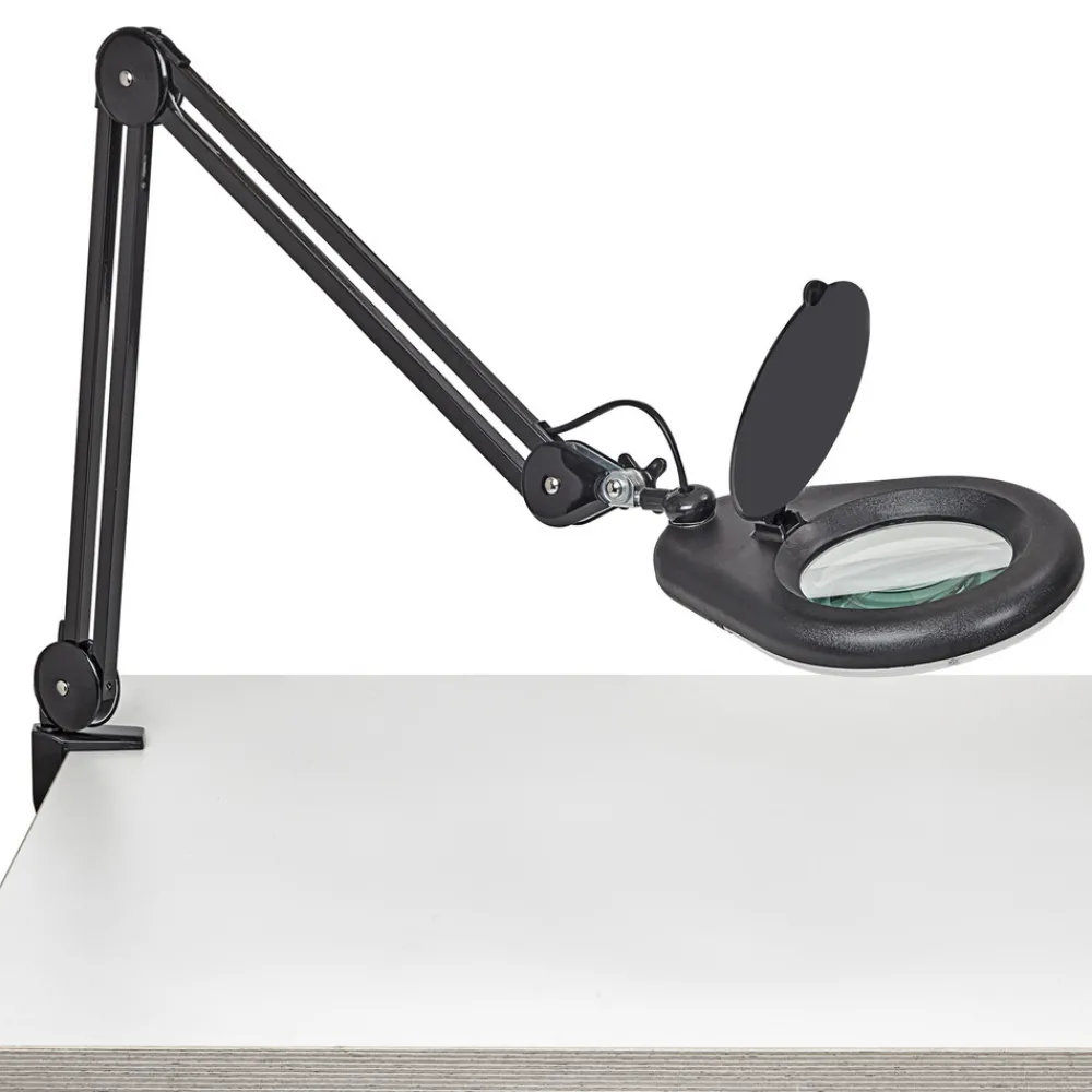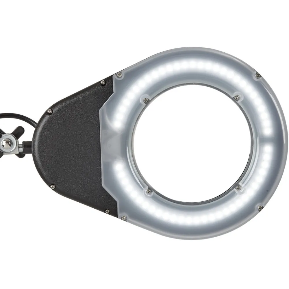 Praktisk MAULviso LED-lupelampe med klemme MAULviso LED-klemmelampen med sitt ringformede arrangement av lysdioder gir kontinuerlig og skyggefri belysning. Takket være den roterbare og vippbare metallarmen og lampehodet er variabel justering garantert. Armaturen kan derfor tilpasses til de ønskede kravene. Det innebygde forstørrelsesglasset med 3-dobbelt glasslinse og 1,75x forstørrelse oppfyller ikke bare sitt formål for privat bruk, men er også populært i kommersielle lokaler. Beskyttelsesdekselet beskytter luplampen mot tilsmussing, noe som gjør den ideell for bruk på verkstedet.