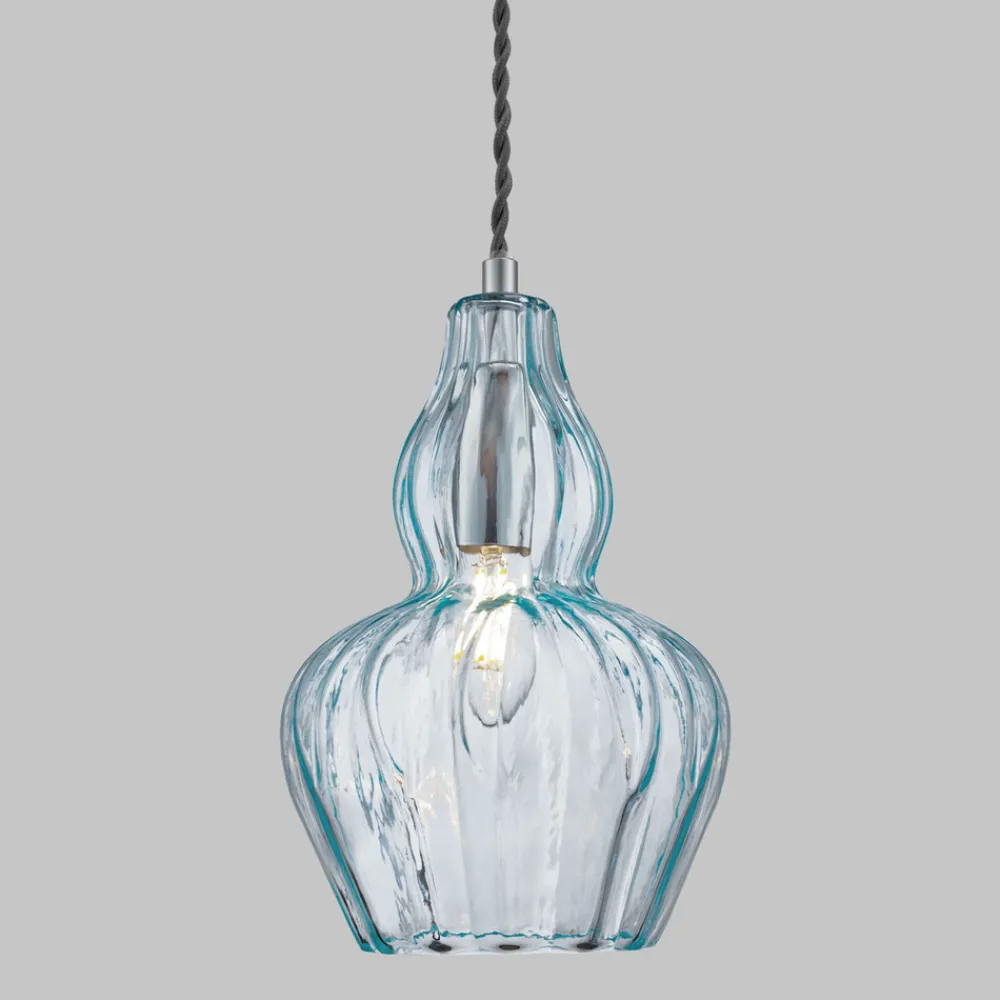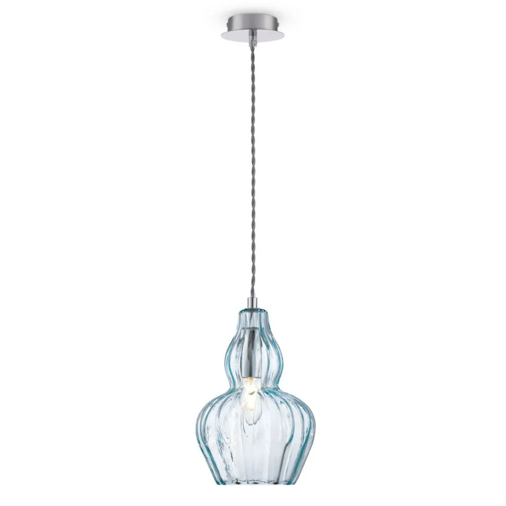 Den pendellampe Eustoma presenterer seg med en metallkontakt som henger fra en vridd suspensjon, som er omgitt av en imponerende vakker glass. skjerm er ikke bare tiltalende på grunn av sin ekstravagante form, men også på grunn av farget gjennomsiktighet, som også gir lyset som sendes ut i alle retninger en spesiell stil.