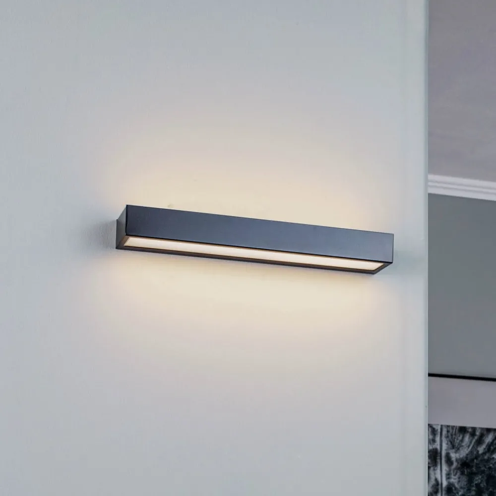 LED-vegglampe Mera i elegant svart kombinerer stilig design med moderne funksjonalitet. Med en bredde på 40 cm passer den perfekt inn i ulike romkonsepter og setter målrettede aksenter. Den integrerte LED-teknologien sørger for jevn og energieffektiv belysning som passer både til oppholdsrom og arbeidsområder.