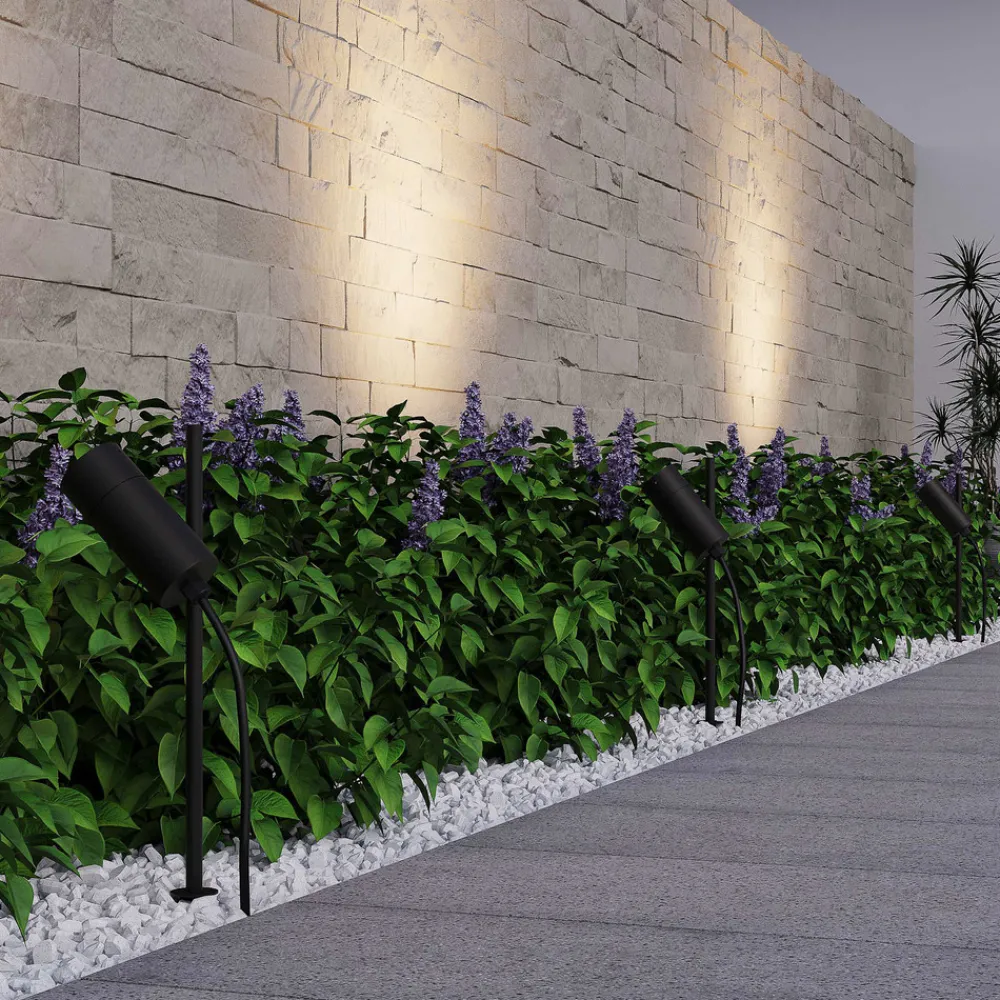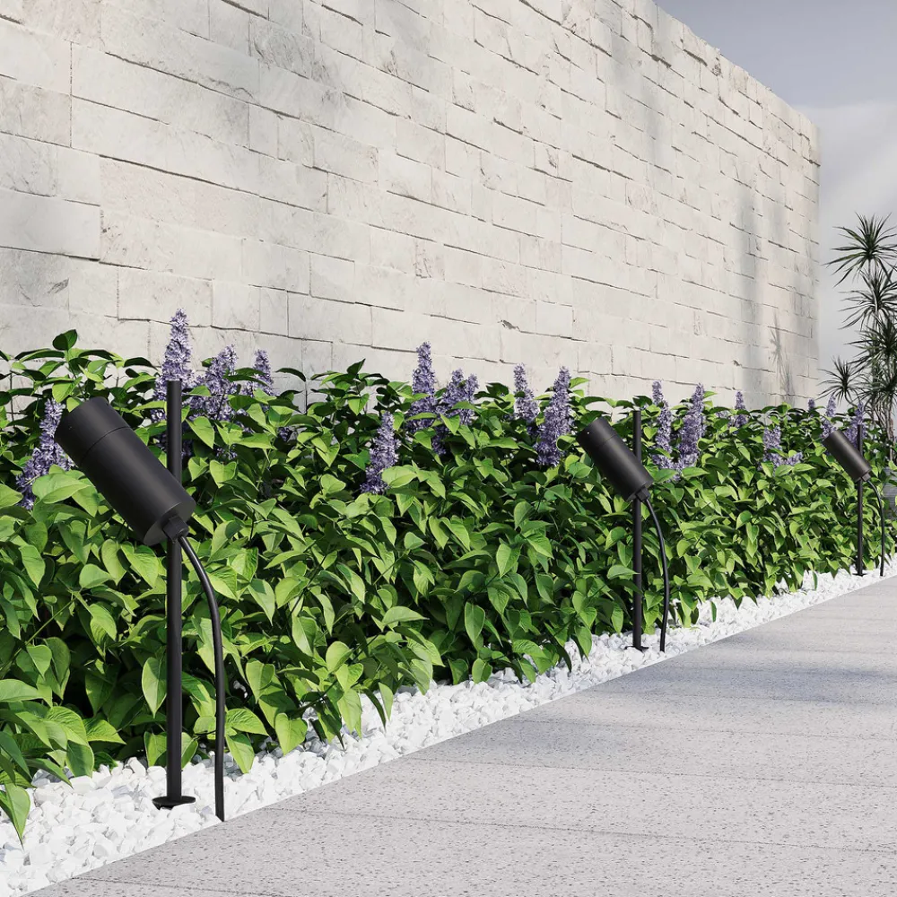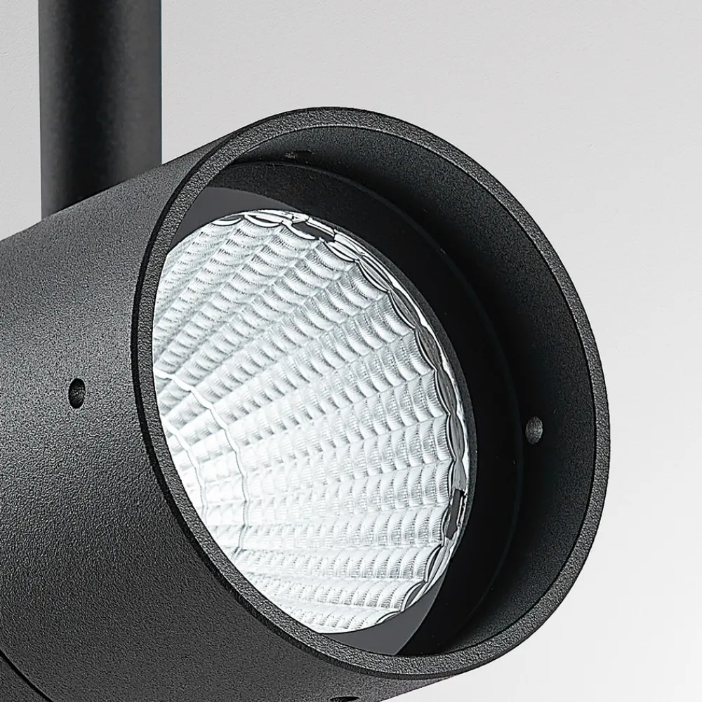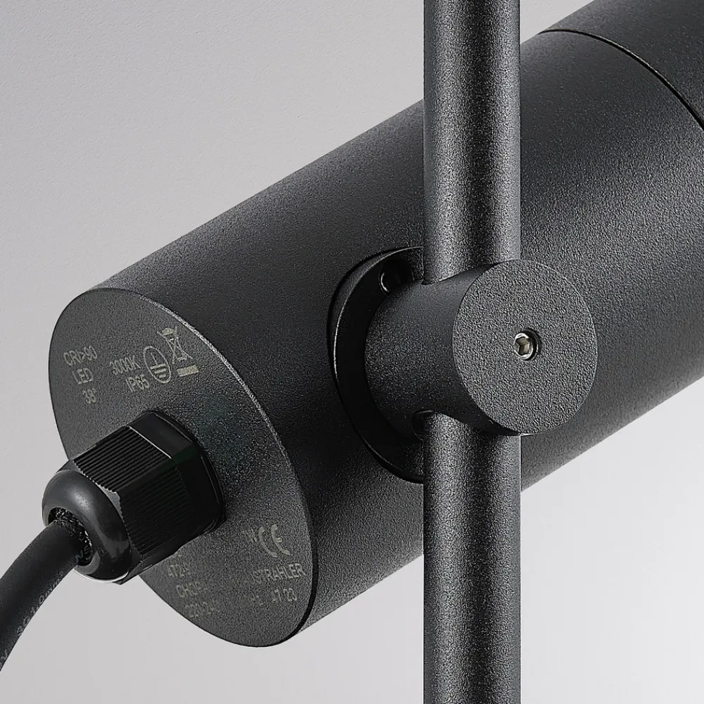 Chopa LED-bakkepinnelampe med justerbart spotlys Hovedformålet med Chopa-bakkepinnelampen er å gi orientering eller å belyse bestemte områder i hagen. Det sylinderformede hodet er montert på en tynn stang og er laget av aluminium i en enkel, mattsvart finish. Spotlightens høyde på stangen kan justeres individuelt og festes med en skrue på leddet. Den kan også svinges og vippes fullstendig. Takket være den store fleksibiliteten blir hagen eller den offentlige parken et høydepunkt også på kveldstid og innbyr til opphold.