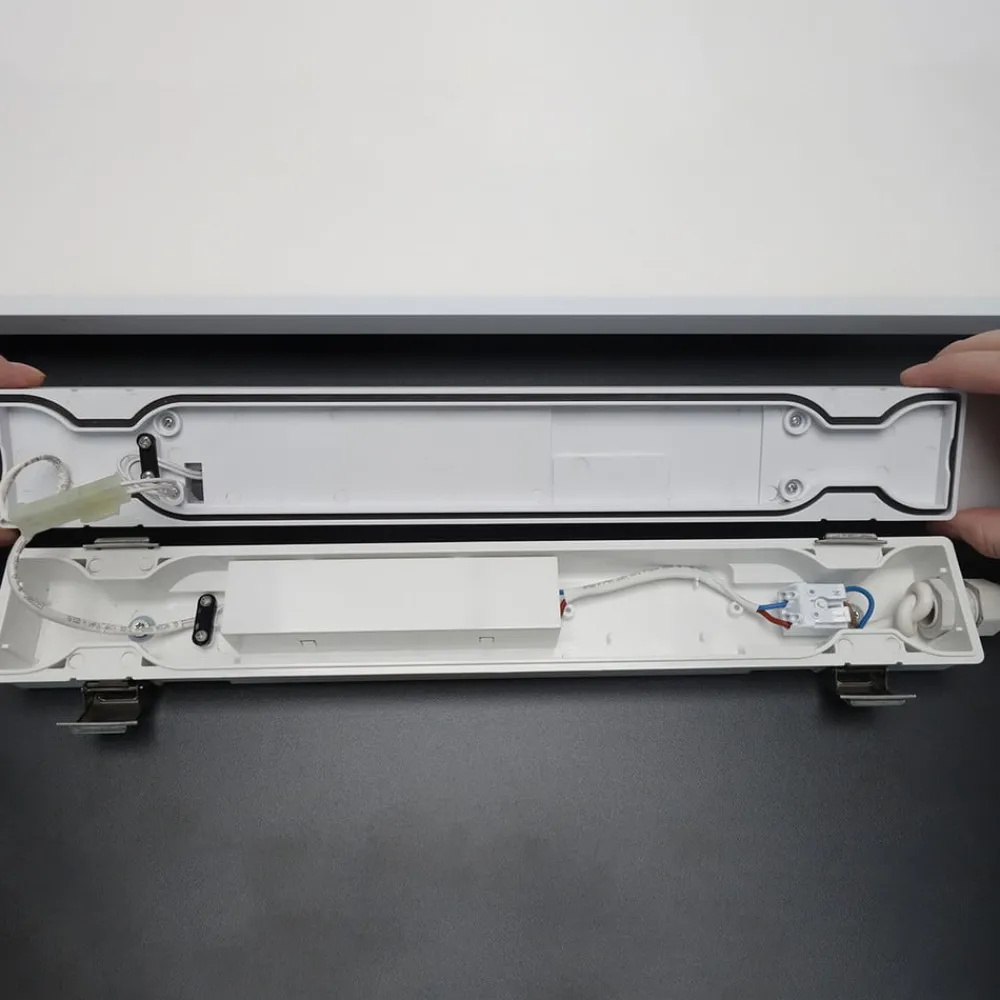 Fuktsikker LED-armatur Aquafix for kjellere, verksteder og utendørsDen fuktsikre LED-armaturen Aquafix egner seg til belysning av kjellere, garasjer, verksteder og til utendørs bruk. Den overbeviser med en revolusjonerende, spesielt enkel installasjon med separat koblingsboks og husdeler som kan skilles fra hverandre og klikkes sammen igjen. Armaturen kan installeres av én person. Den fuktsikre armaturen er forberedt for gjennomfortrådning med innvendig kabelkanal, 2-foldet lysterklemme, forhåndsbestemt bruddpunkt og medfølgende klemmer for kabelfeste, slik at den kan monteres som en sømløs lyslist. – Lysfarge universalhvit (4 000 K)