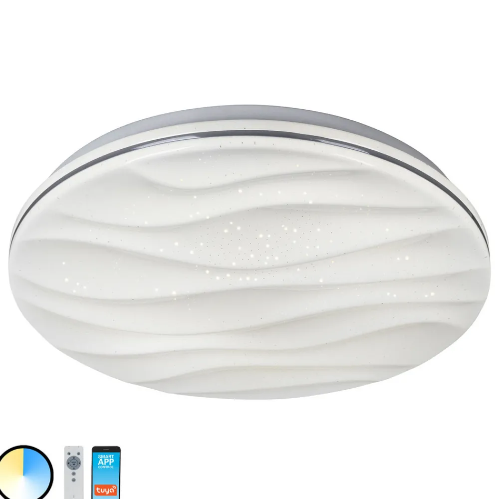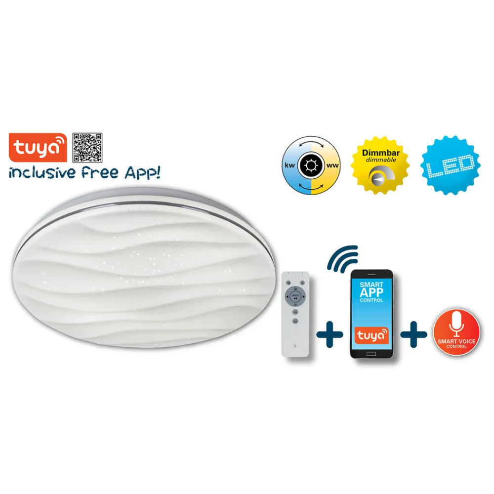 Lyset kan ikke bare styres med den medfølgende fjernkontroll . Etter integrering med den gratis Tuya Smart-appen via WLAN, kan Austin enkelt betjenes med en smarttelefon eller via Amazon Alexa eller Google Assistant ved hjelp av talekommandoer. I tillegg til å dempe og endre fargetemperatur , kan appen også brukes til å stille inn inn- og utkoblingstid (timerfunksjon).