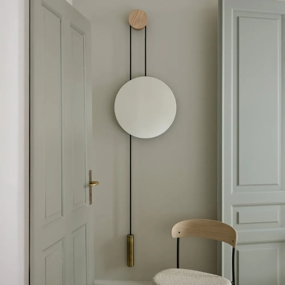 Design i bevegelse: Rise and Shine veggspeil fra New Works Rise and Shine veggspeil benytter dristige former med en asymmetrisk komposisjon for å skape et utfoldende element i ethvert rom. Et mykt senter i eik gjør at speilet og et sylindrisk metallelement kan skyve og trekke mot hverandre og skape et stadig skiftende refleksjonspunkt. Rise and Shine er et midtpunkt fullt av balanse og bevegelse, enten det brukes til ulike funksjoner eller bare som en fascinerende interiørskulptur. Produktmerknader: Dette speilet er omhyggelig utformet, og hvert eksemplar er unikt. Mindre flekker eller små variasjoner i materiale og finish kan forekomme. Sikkerhetsinstruksjoner: I sjeldne tilfeller kan en skadet kant eller riper i overflaten føre til at speilet plutselig brekker i små biter. En slik sprekk kan føre til skarpe splinter, men dette er ekstremt sjeldent. Unngå kollisjoner fra siden – det er her glasset er mest følsomt. Kun beregnet for innendørs bruk. Pleieinstruksjoner: Tørk av produktet med en myk, tørr eller fuktig klut. Ikke bruk slipende rengjøringsmidler eller sterke rengjøringsmidler som f.eks. glassrengjøringsmidler, white spirit eller terpentin.