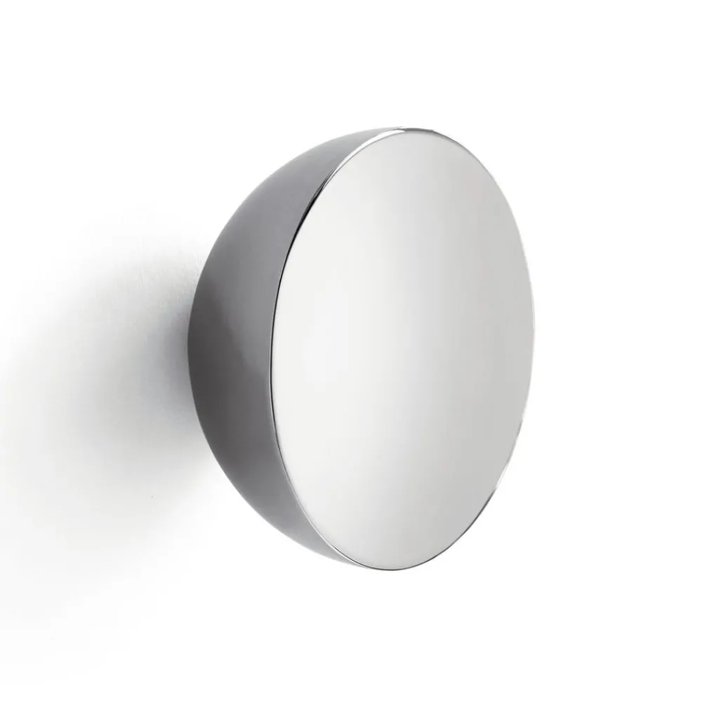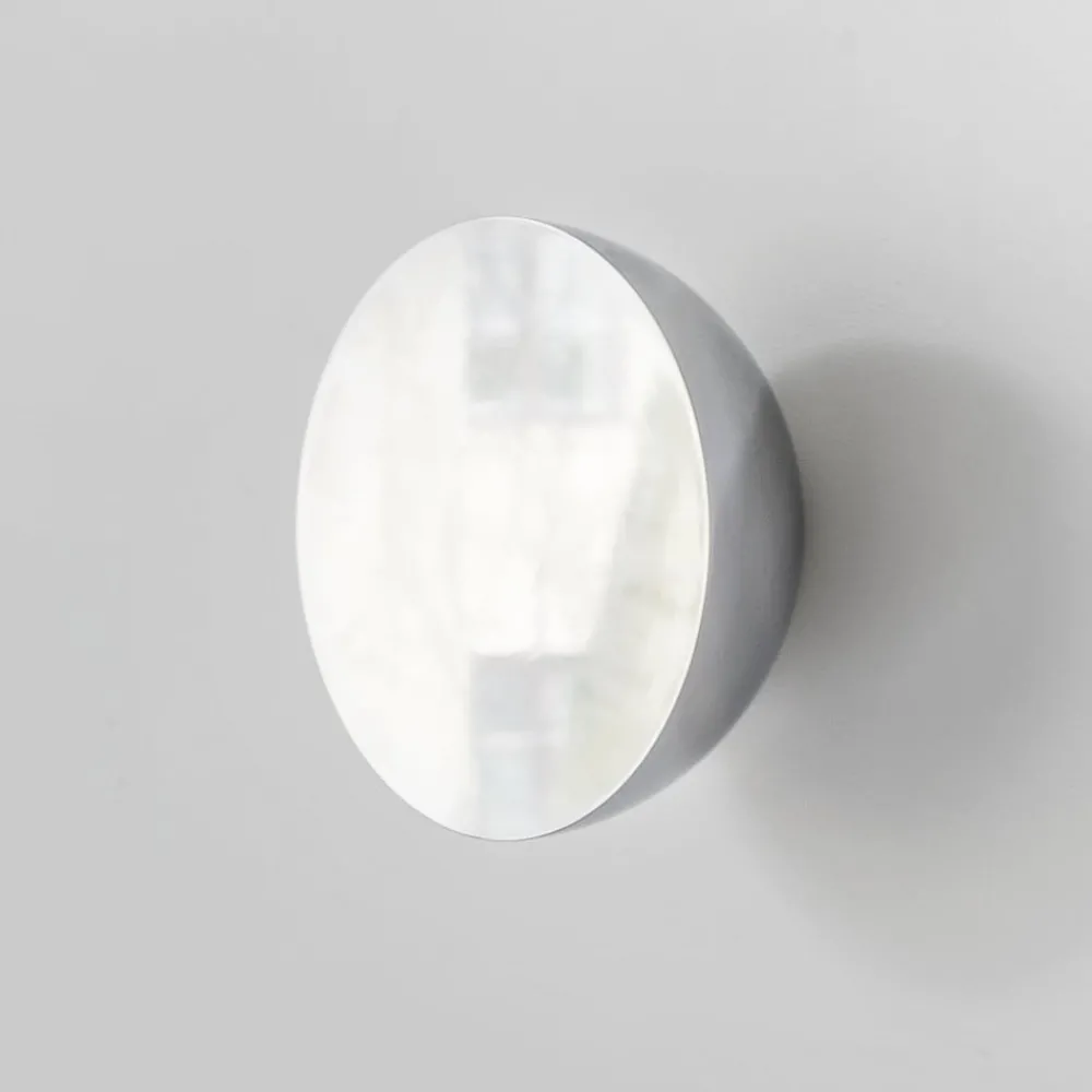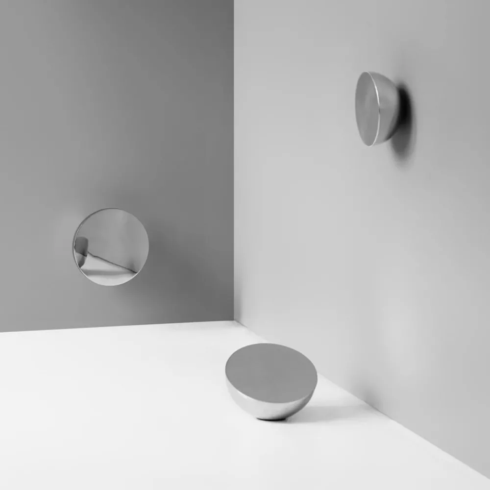 Den dristige materialiteten til veggspeglen Aura skaper en unik indre glød – helt uten belysning. Den er laget av polert stål og formet som en halvkule, og fanger opp lyset fra omgivelsene og skaper mangfoldige refleksjoner gjennom kombinasjonen av harde, flate overflater og lange kurver. Vekten og tykkelsen balanseres av den myke glansen og den skulpturelle, buede formen.
