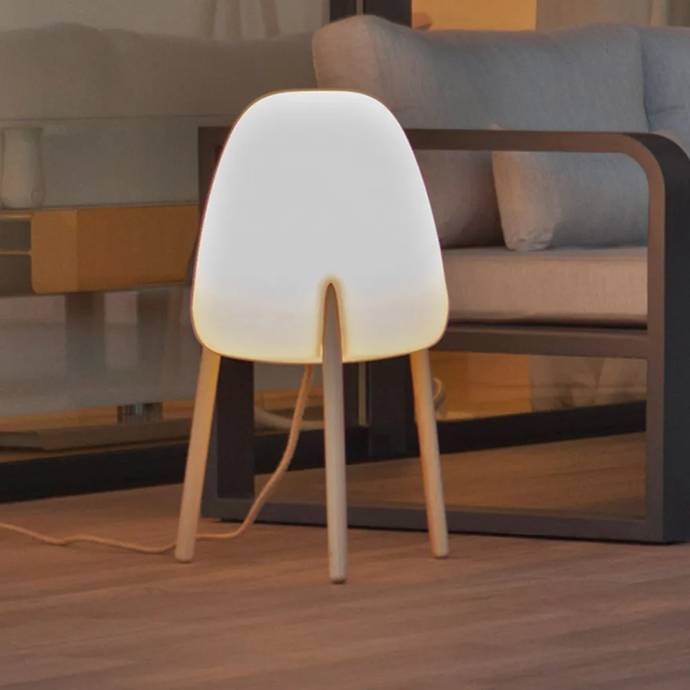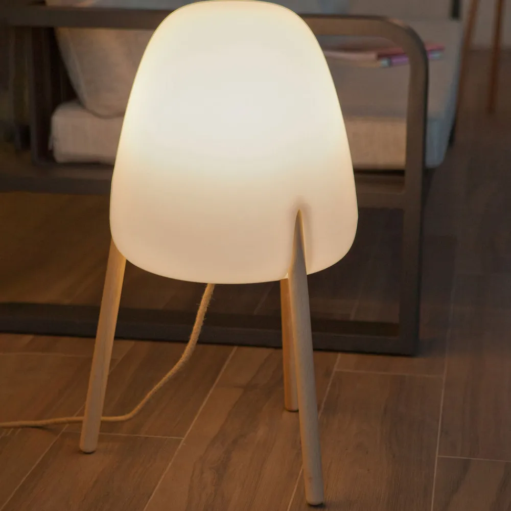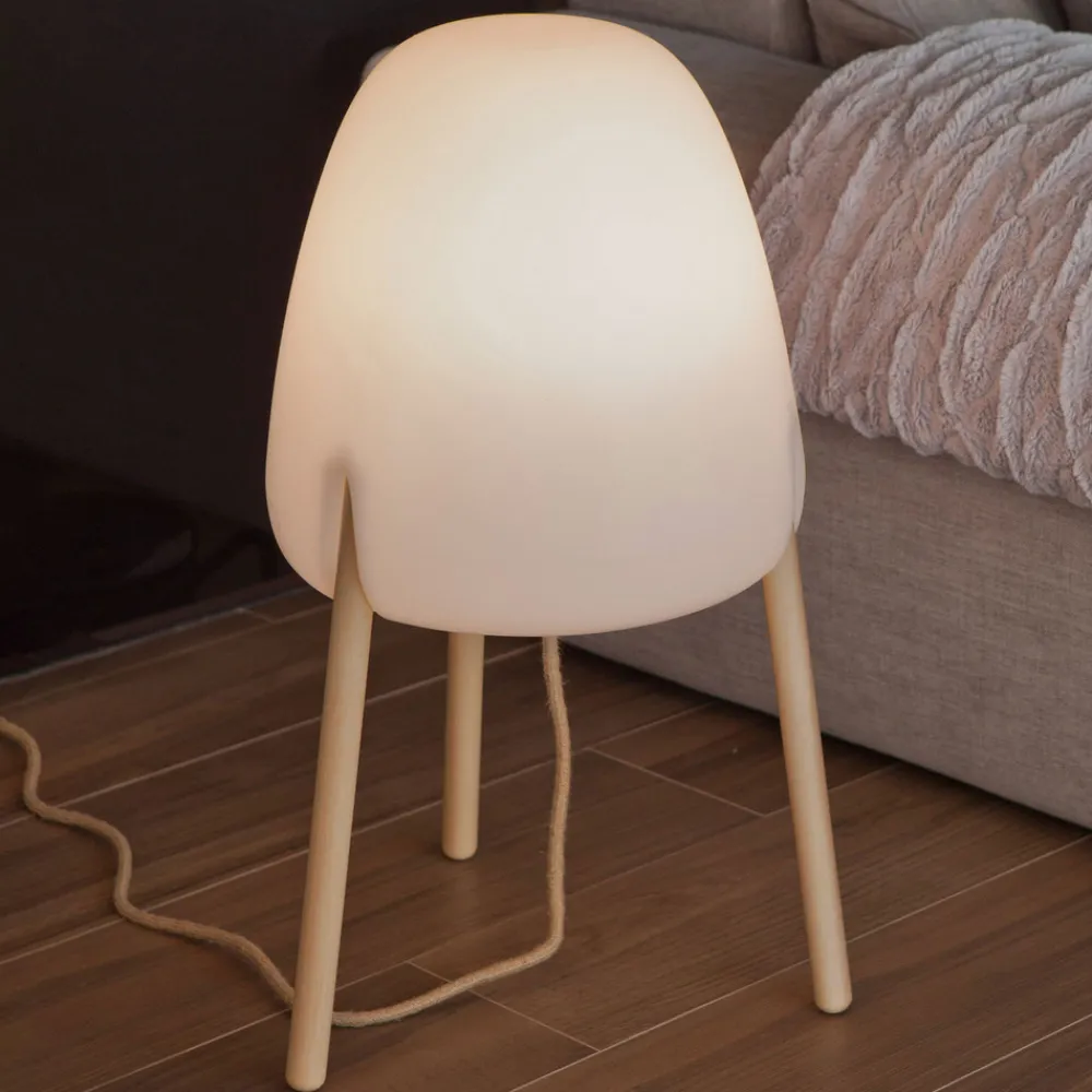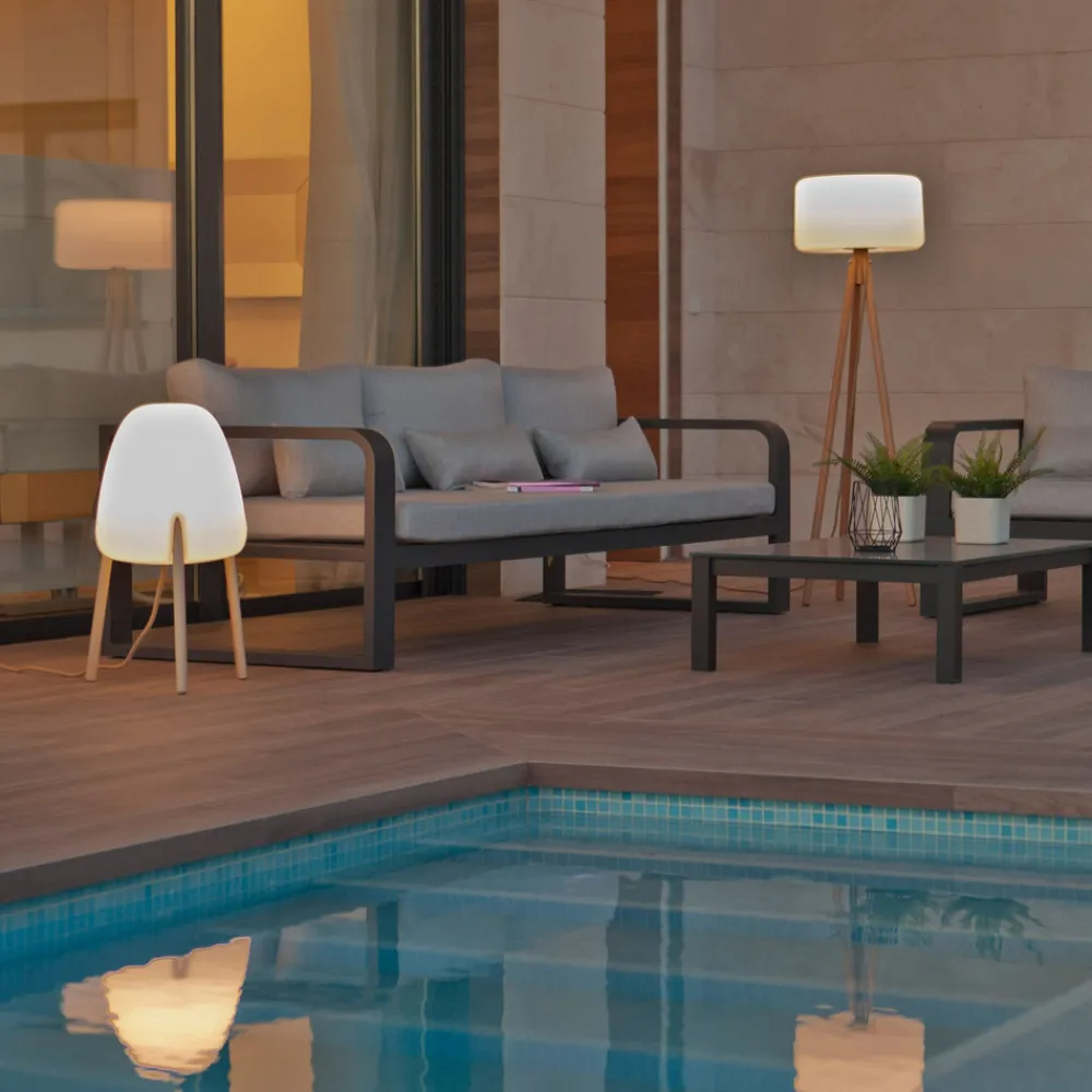 Rocket In & Out gulvlampe med trebenet treramme Kombinasjonen av en trebenet ramme av lyst treverk som er behandlet for utendørs bruk, og en skjerm av UV-bestandig og værbestandig polyetylen på innsiden gjør Rocket gulvlampe til en dekorativ lyskilde både utendørs og innendørs. Den er robust og takket være kapslingsgraden IP65 er den optimalt beskyttet mot alle værforhold og gir et svært variabelt justerbart lys, ettersom armaturen leveres med en E27-lyskilde som kan justeres svært fleksibelt ved hjelp av den medfølgende fjernkontrollen for å sikre riktig belysning til enhver tid. Lyskildens lysfarge kan varieres fra varmhvit belysning med 2700 K til sterkt dagslys med 6500 K, og lysstyrken kan også dimmes trinnløst i alle lysfarger. Rocket gulvlampe er et belysningsobjekt produsert i Spania av Newgarden. Den er utstyrt med en 4 meter lang utendørskabel – kapslingsgrad for utendørs bruk – kan brukes i omgivelsestemperaturer fra – 20 til 45 °C