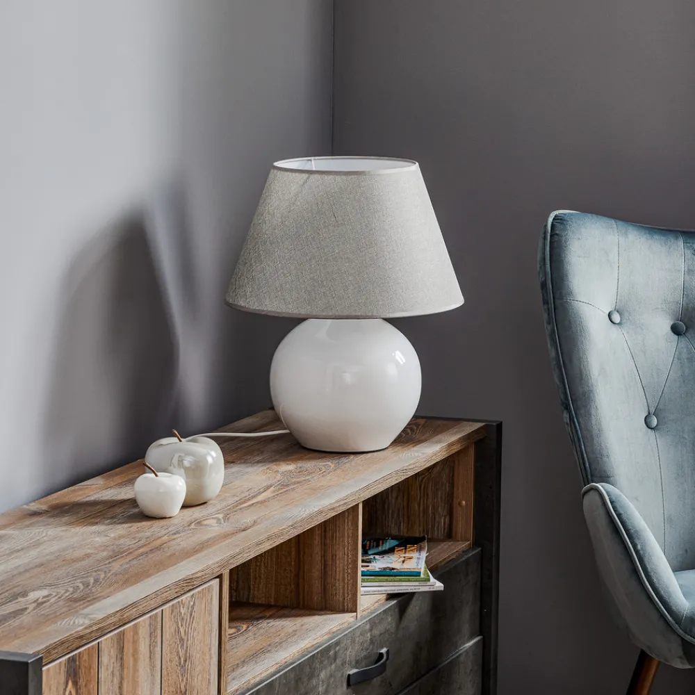 Bordlampen Sfera kombinerer stilig design med funksjonell belysning og er et høydepunkt i ethvert oppholdsrom. Den er laget av høykvalitets tekstil og keramikk og imponerer med sin harmoniske farge i lysegrått og hvitt. Denne kombinasjonen gir lampen en tidløs eleganse som passer perfekt inn i stuen, soverommet eller spisestuen.