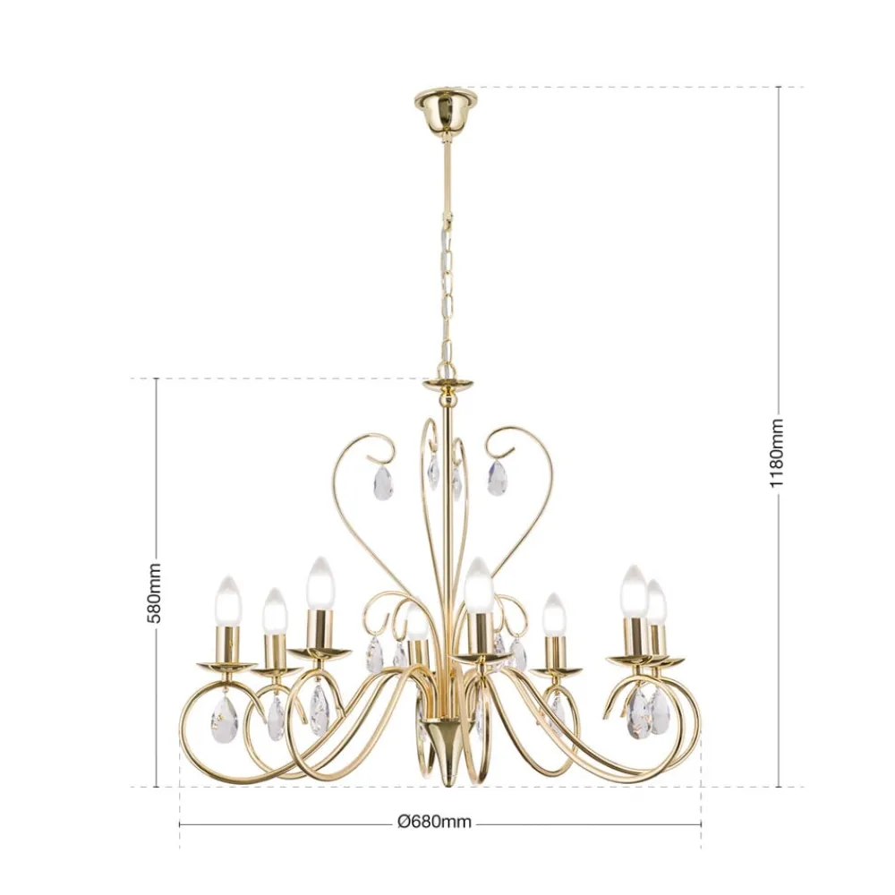 Elegant Alessia lysekrone med åtte flammerLysekronen Alessia er ekstremt grasiøst formet, med fasede blykrystaller og en forgylt jernfinish. De åtte stearinlysformede pærene gir et sterkt, lett glitrende lys i hele rommet.