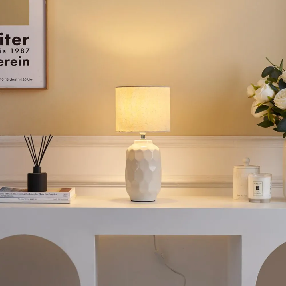 Charming Sparkle bordlampe i kremfarget tekstil og keramikk Den kremfargede bordlampen Charming Sparkle er en koselig ekstra lyskilde i stuen og på soverommet. Den sylinderformede lampeskjermen er laget av tekstil. Den håndlagde keramikksokkelen har den typiske formen til en vase. Inklusive støpselkabel med bryter.