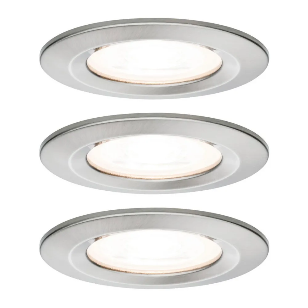 Nova LED-spotlight i sett med 3 stk. med IP44-beskyttelse og 3-trinns dimmer Nova LED-spotlight i sett med 3 stk. gjør det mulig å skape et skreddersydd belysningskonsept. De er enkle å montere i taket ved hjelp av festefjærer og kan enkelt kobles sammen med valgfri avstand. LED-spottene er laget av aluminium og er runde. Den utskiftbare LED-lyskilden med GU10-sokkel avgir varmhvitt lys nedover i rommet og kan dimmes i tre trinn med en vanlig lysbryter. Takket være IP44-sprutbeskyttelse kan de brukes i fuktige rom.