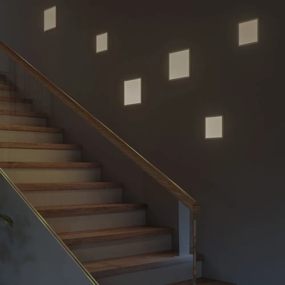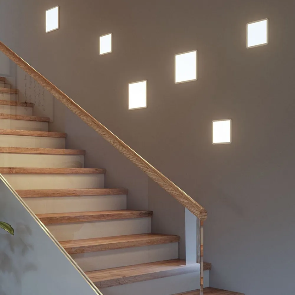 Areo VariFit innfelt LED-panel i kvadratisk form 3-trinns bryter som kan slås på via lysbryter Areo VariFit innfelt LED-panel monteres i taket eller på veggen, enkeltvis eller i flere enheter, og gir et universelt hvitt lys som stråler jevnt ut gjennom diffusoren. Kombinasjonen av ulike størrelser er spesielt effektiv. Uten at det er nødvendig å installere en dimmer, kan lysstyrken på panelet stilles inn i tre nivåer ved hjelp av den eksisterende veggbryteren. En minnefunksjon lagrer den valgte lysstyrken til neste gang den slås på. Takket være de justerbare fjærklemmene på baksiden passer panelet inn i mange forskjellige monteringsåpninger, noe som gjør det egnet til å erstatte eksisterende innfelte armaturer. – Egnet for forskjellige monteringsdiametre takket være justerbare fjærklemmer – Kan også brukes i fuktige rom takket være IP44 – Kan byttes til tre lysstyrkenivåer ved hjelp av veggbryteren: 100 %, 50 %, 25 %