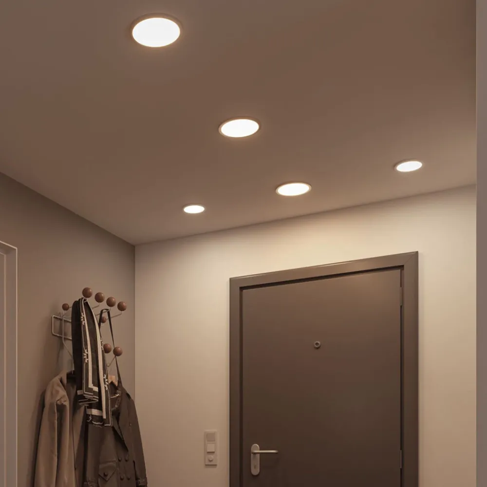 Rundt LED-panel for innbygging Areo VariFit, universal hvit, tretrinns dimbar via veggbryter Areo VariFit LED-panel for montering i tak eller vegg er rundt, enkelt og fleksibelt. Panelet har en lav monteringshøyde på bare 1,2 cm og en smal ramme som passer inn i ethvert interiørkonsept. Det er utstyrt med hvite universal-LED som lyser jevnt gjennom diffusoren og kan stilles inn i tre lysstyrkenivåer ved hjelp av den eksisterende vegglampebryteren. Minnefunksjonen lagrer den valgte lysstyrken til neste gang den slås på. Det innfelte panelet egner seg ikke bare for nye installasjoner, men passer også inn i mange eksisterende installasjonsåpninger takket være de justerbare klemfjærene på baksiden. I kombinasjon med flere armaturer i samme eller ulike størrelser gir panelet ikke bare et flott utseende, men også en god grunnbelysning i større rom. Det er også uproblematisk å bruke panelet på badet eller i andre fuktige rom, siden det har kapslingsklasse IP44 – Justerbare fjærklemmer på baksiden – 3 lysstyrkenivåer: 100 %, 50 % og 25