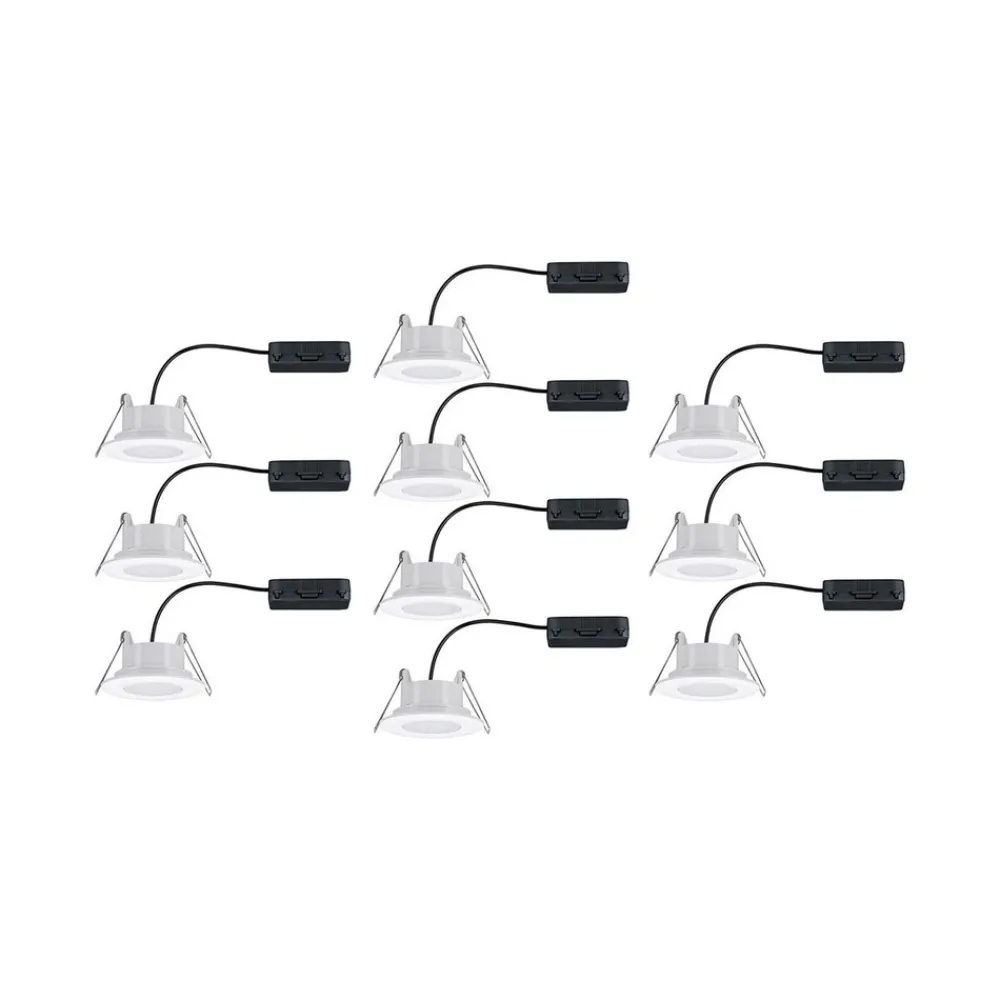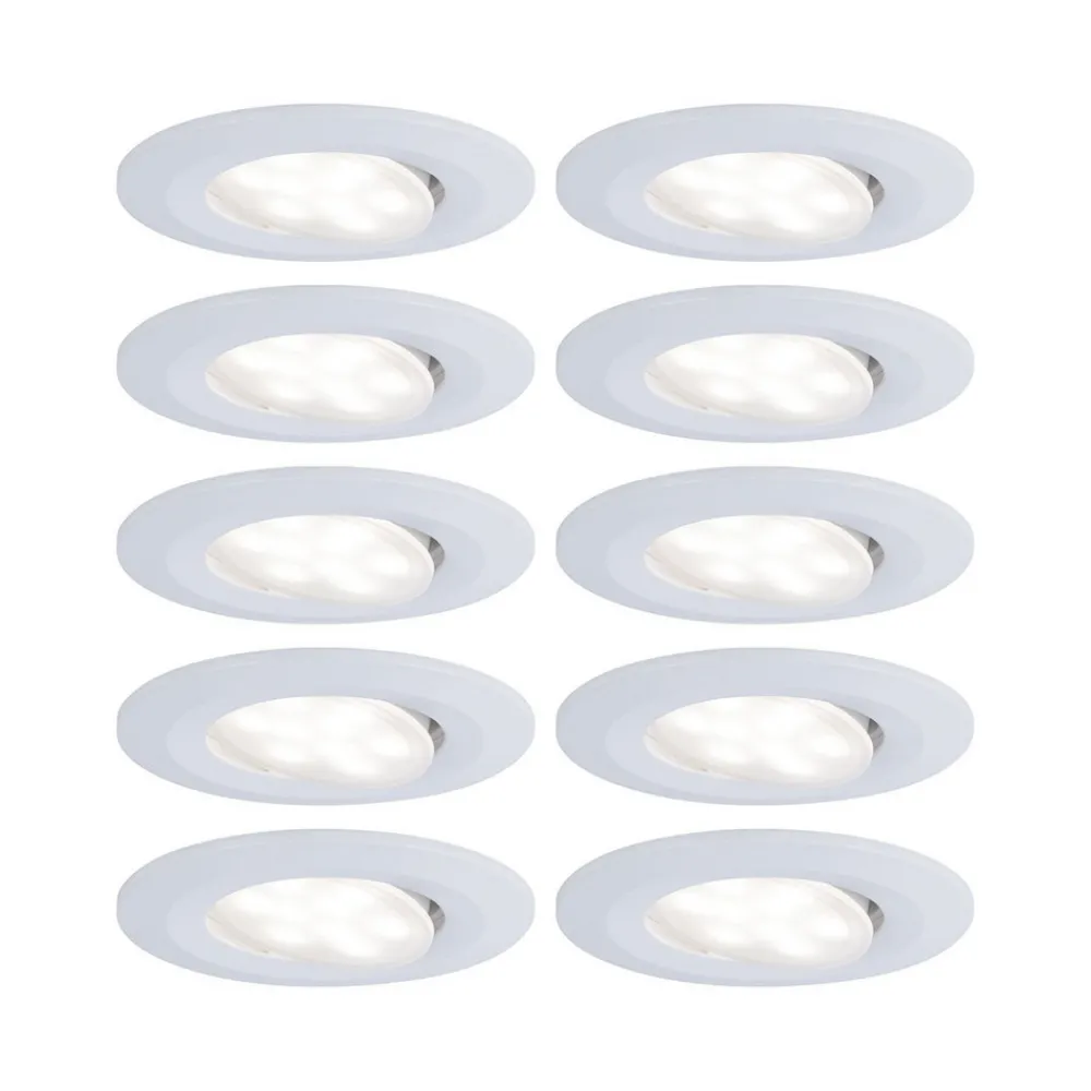 Vannstrålebeskyttet Calla innfelt LED-spotlight i sett med 10 stk. for takmontering i utendørs og fuktige områder Med Calla tilbyr Paulmann en mester i allsidighet. Fra utendørs og fuktige områder, salgs- og kontorlokaler til baderom og korridorer i private hjem, fungerer den innfelte LED-lampen som en effektiv, men likevel visuelt diskret lyskilde i taket. Den praktiske 10-pakningen kan også brukes til å utstyre større rom eller områder. Modulen med de energieffektive LED-lampene, som har en strålevinkel på 100° og kan svinges innenfor et område på 30°, er plassert i midten av en plastsirkel. Det hvite universallyset avgis blendingsfritt gjennom en matt avdekning. Innbyggingsspottene kan kobles direkte til 230 V-utgangen og kobles sammen.