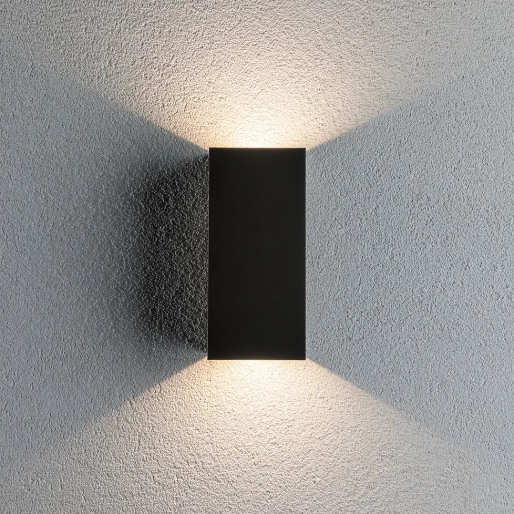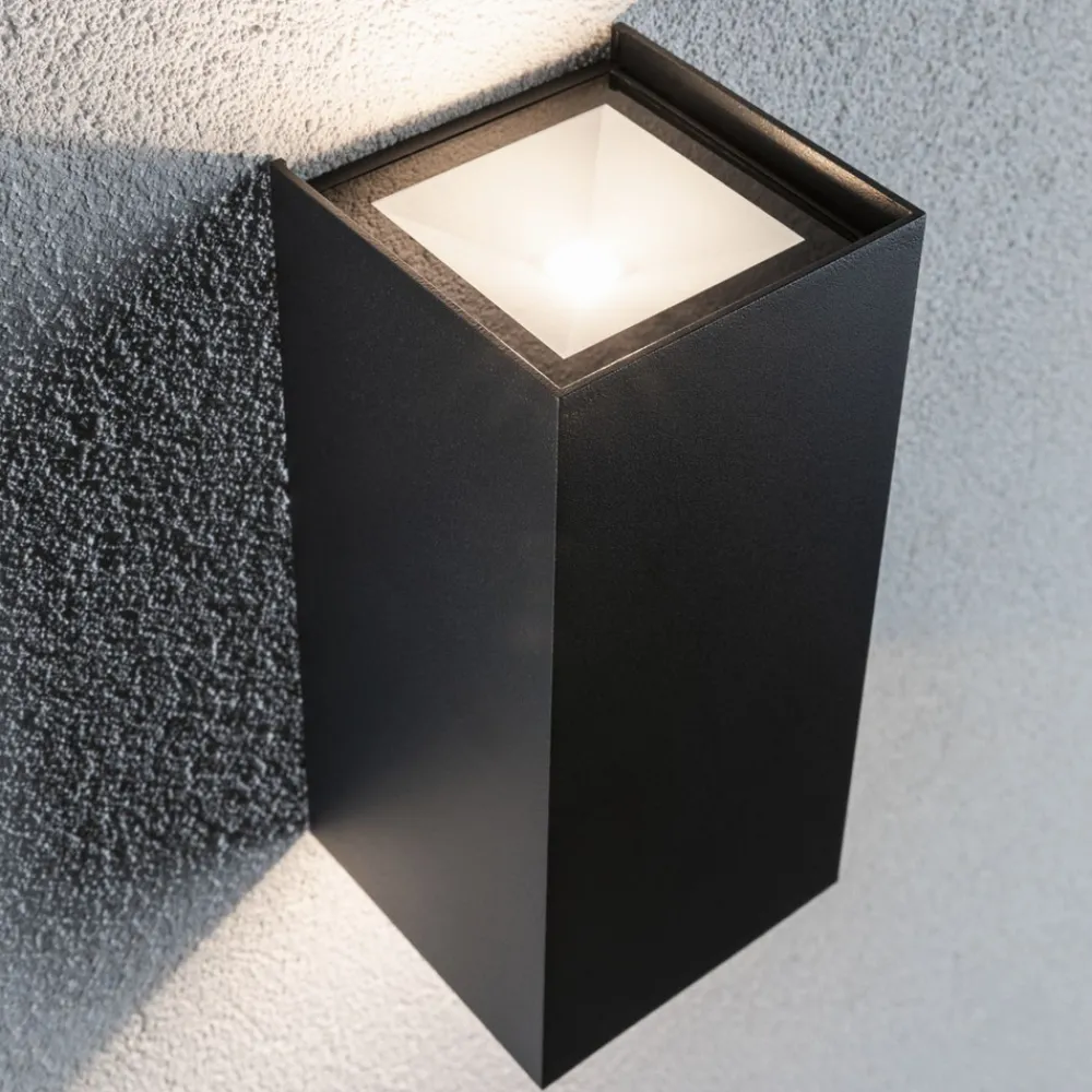 LED utendørs veggarmatur Flame, oppover- og nedoverstrålendeMed den antrasittfargede, kubiske LED-veggarmaturen Flame kan du sette effektfulle lysakkorder på fasaden – for eksempel til venstre og høyre for husets inngangsparti. Armaturen er laget av robust aluminium, er beskyttet mot vær og vind takket være kapslingsklasse IP44 og er svært energieffektiv, krever lite vedlikehold og har lang levetid takket være moderne LED-teknologi.
