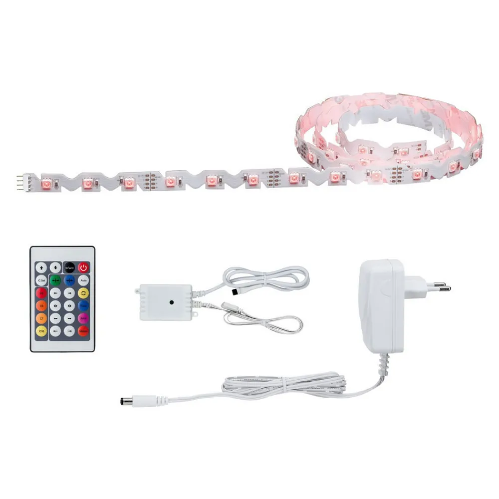 FlexLED 3D settet RGB imponerer med stor fleksibilitet noe som skyldes de stansede stripene. Stansingen gjør at det er lettere å legge stripene. Dette gjelder også hjørner med en vinkel på minimum 90 grader samt tredimensjonale kanter og kurver. LED-lysene med RGB-belysning sørger dessuten for et stemningsfullt og enestående lysbilde. Du tenner, slukker, dimmer og styrer lyset med fjernkontroll. Stripene er lette å montere siden de har teip på baksiden. Stripene kan forkortes ved behov. Legg da merke til de angitte markeringene.