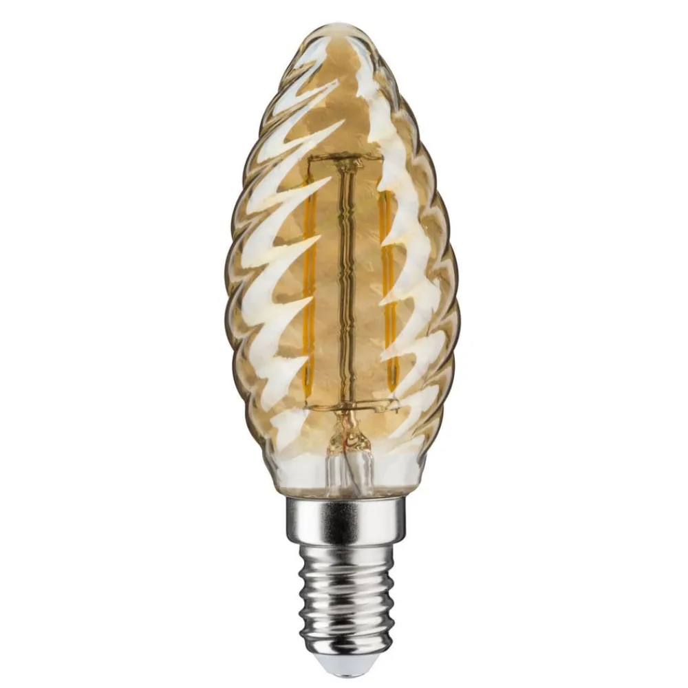 Denne LED-mignonpæren E14 er en lyspære som er utviklet for åpne lamper og dekorative belysninger, og som begeistrer med et klart vridd glass med gyllen fargetone og en svært varm lysfarge.