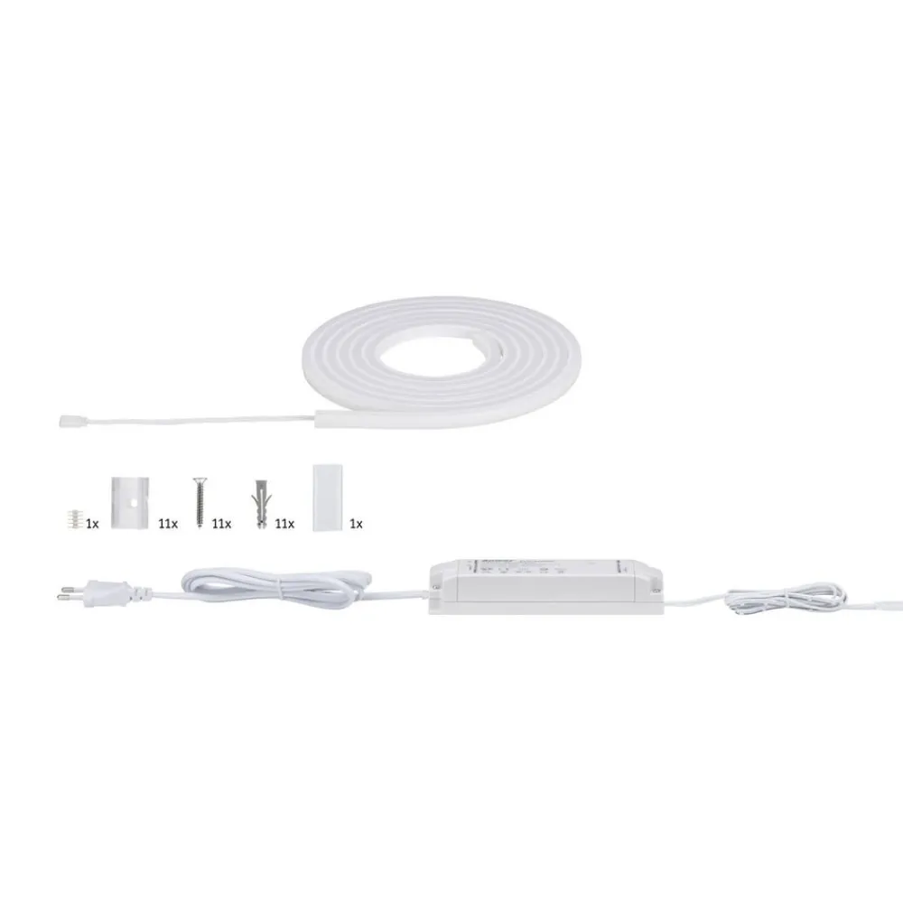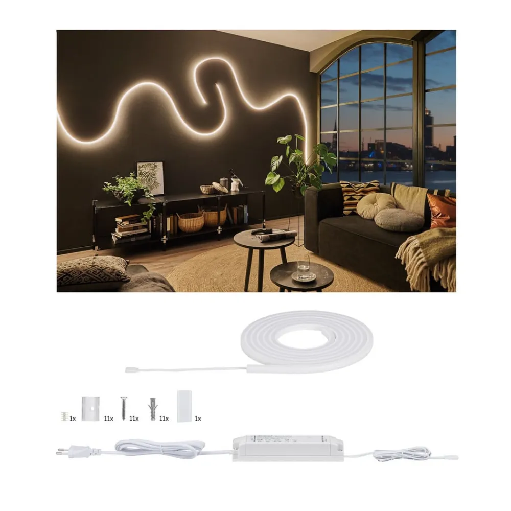 MaxLED Flow basissettet avgir omfattende lys uten synlige LED-punkter. MaxLED Flow er utstyrt med en fleksibel profil og innkapslet med en stor strålevinkel. Festet er mulig i rette strekk så vel som i buede linjer. Dette unike lyselementet har IP67-beskyttelse, slik at en effektiv design også er mulig i fuktige rom og velværeområder. I tillegg til stripen og strømforsyningen inkluderer settet også de knapt synlige, gjennomsiktige festeklemmene, skruene og plugger.