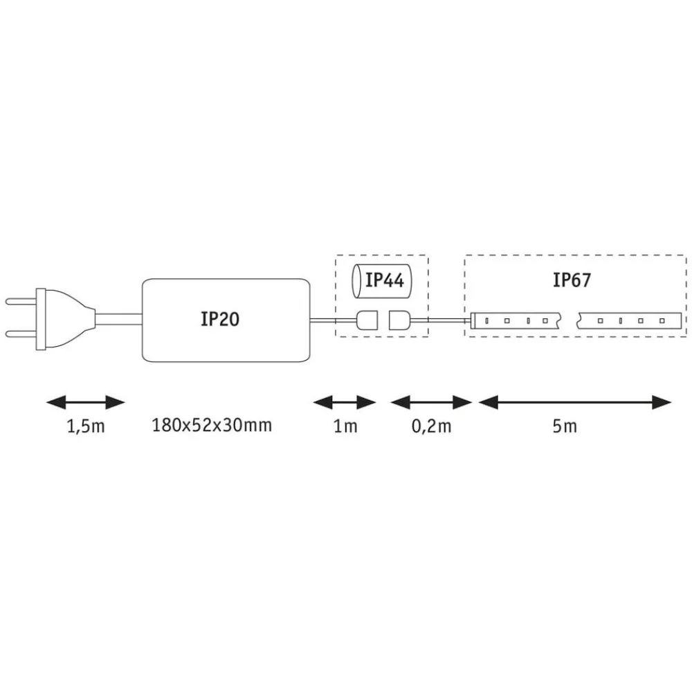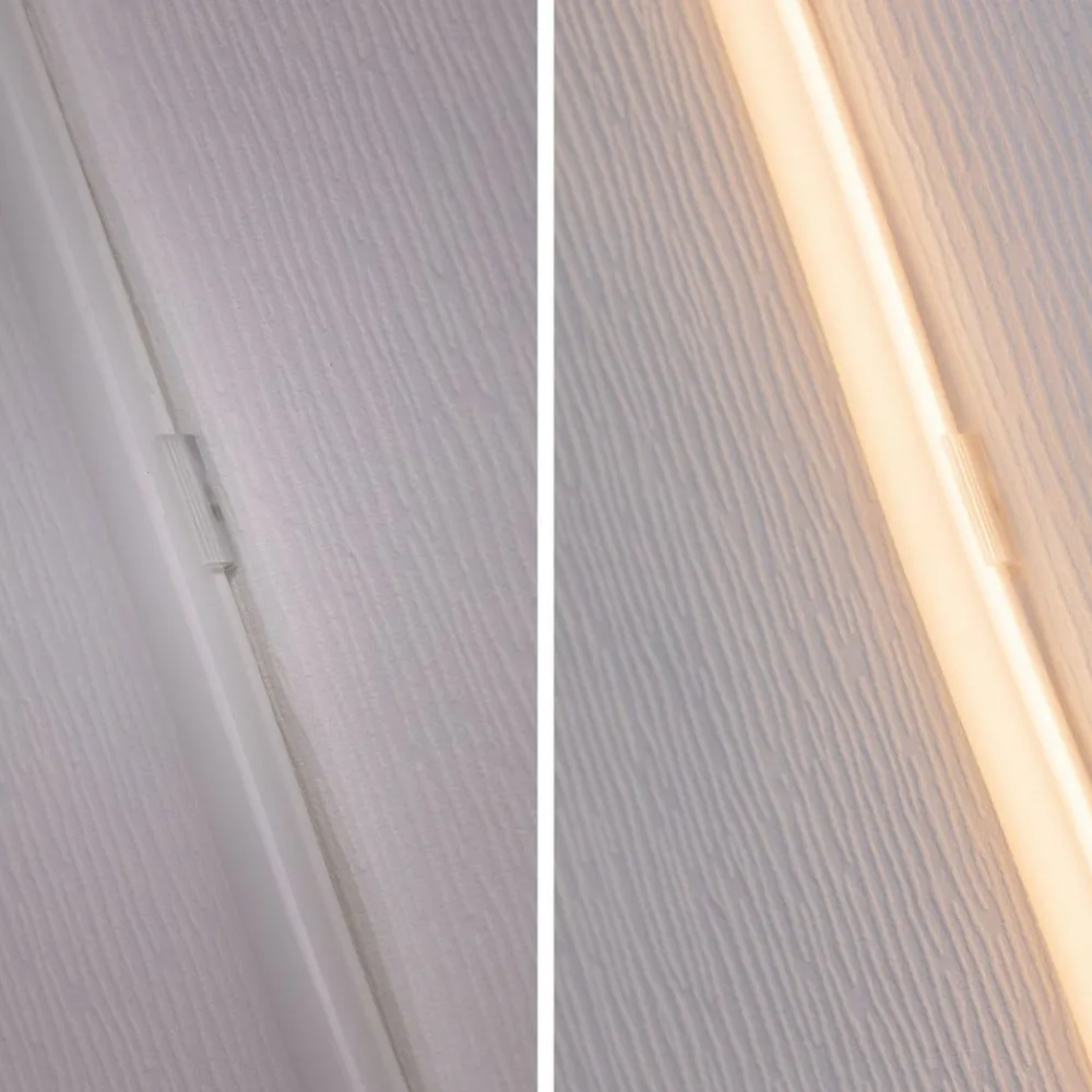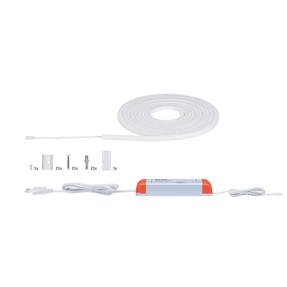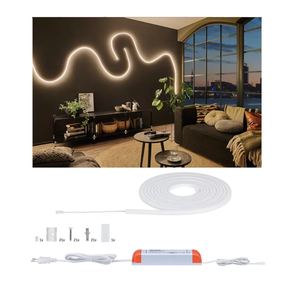 MaxLED Flow basissettet avgir omfattende lys uten synlige LED-punkter. MaxLED Flow er utstyrt med en fleksibel profil og innkapslet med en stor strålevinkel. Festet er mulig i rette strekk så vel som i buede linjer. Dette unike lyselementet har IP67-beskyttelse, slik at en effektiv design også er mulig i fuktige rom og velværeområder. I tillegg til stripen og strømforsyningen inkluderer settet også de knapt synlige, gjennomsiktige festeklemmene, skruene og plugger.