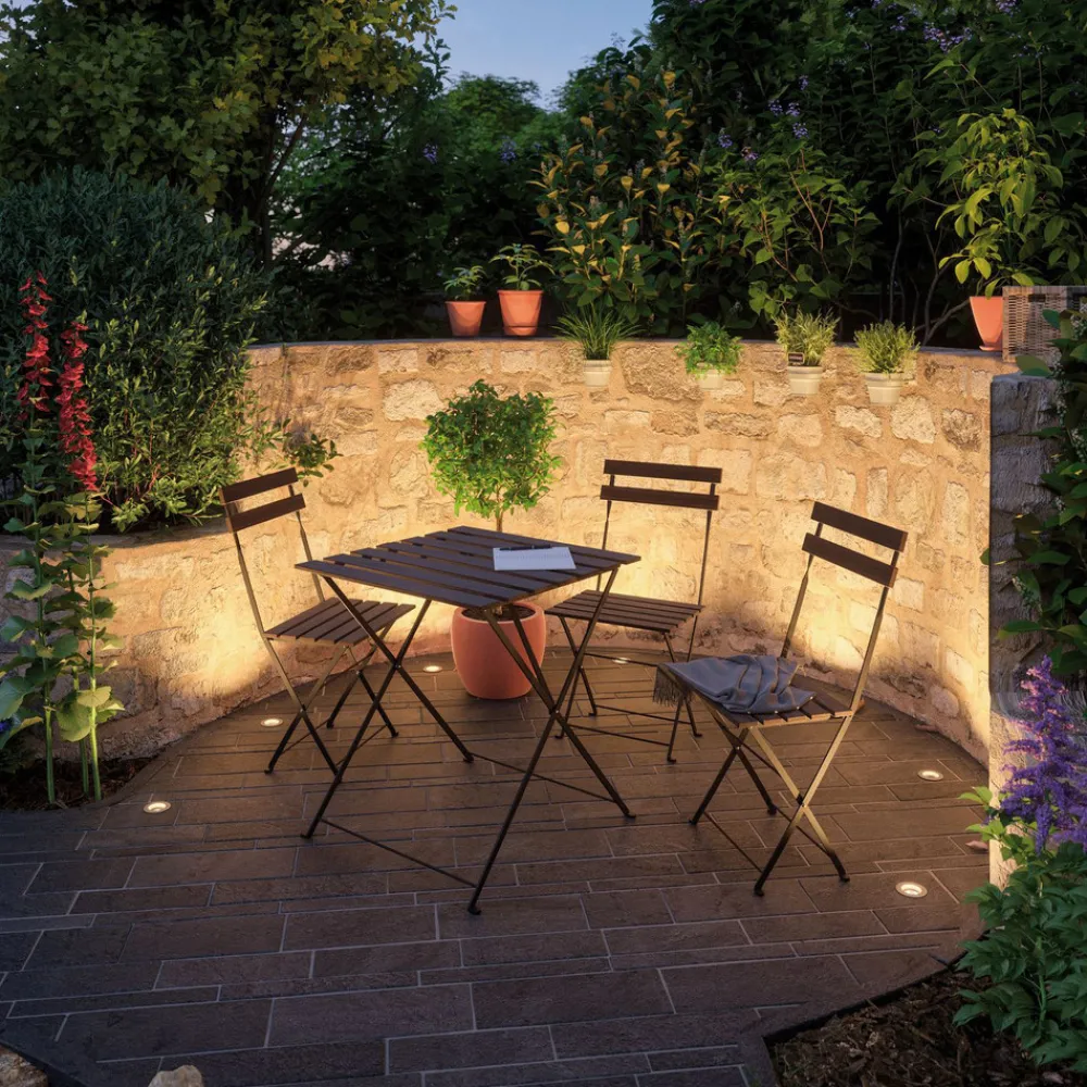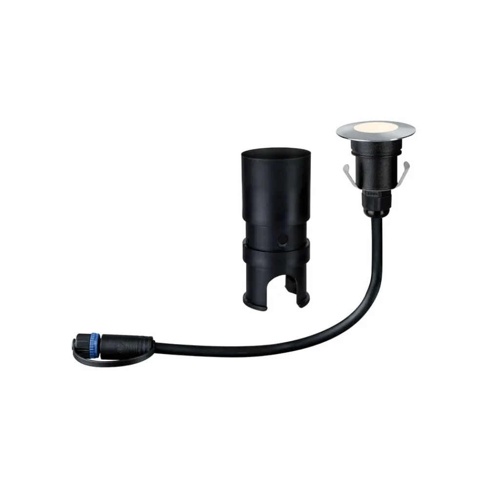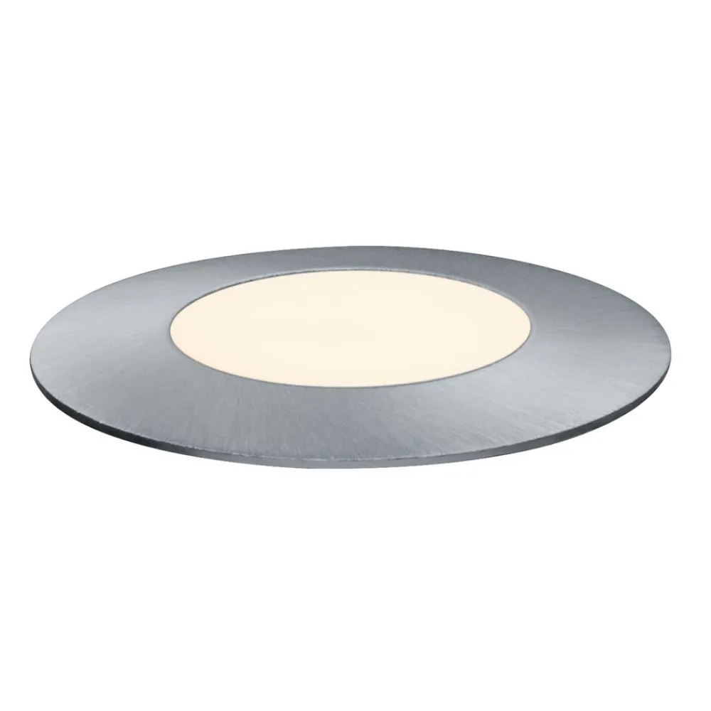 Liten og rund nedfelt lampe Plug & Shine Floor Mini, enkeltlys Enten den brukes enkeltvis eller i grupper på flere – den runde nedfelte lampen Floor Mini med moderne ramme i rustfritt stål og matt plastdeksel gir et behagelig aksent- og orienteringslys i hagen, langs stien eller på terrassen. Med en driftsspenning på 24 V og vannbeskyttede kabler, tilkoblinger og lamper er Plug & Shine fra Paulmann en allsidig og sikker belysningsløsning for uteområder.