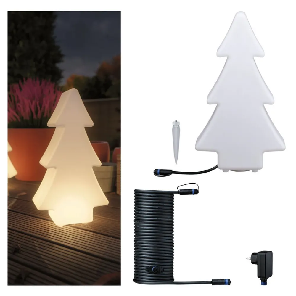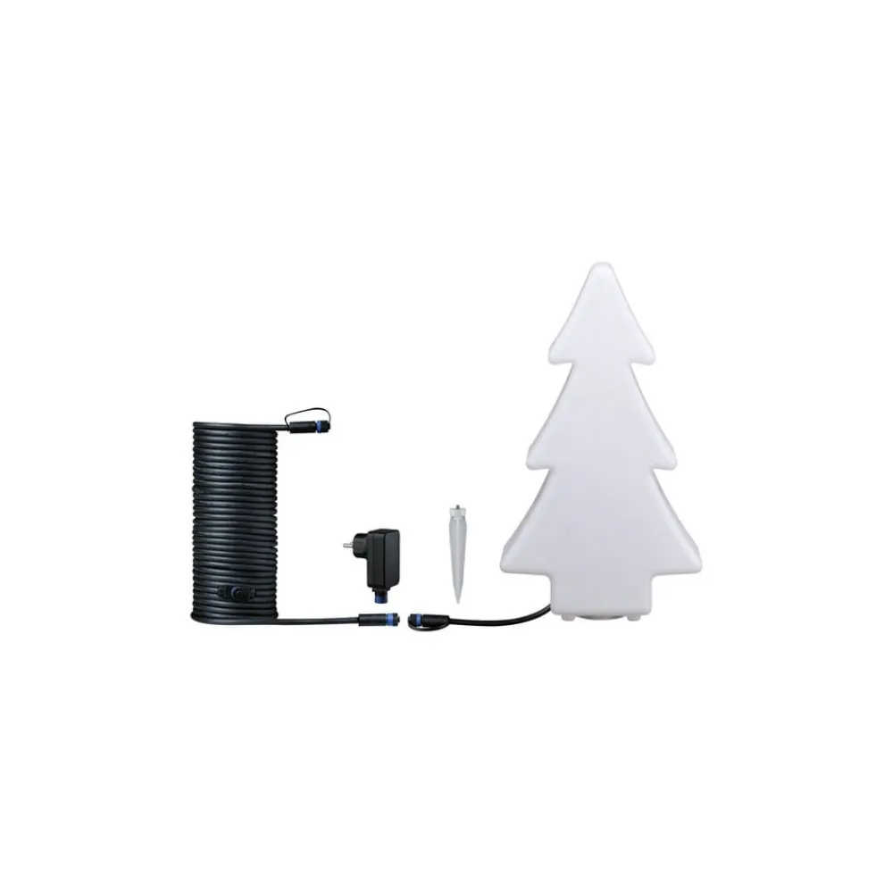 Treformet Plug & Shine LED-dekorasjonsbelysning Tre med plug-in strømforsyning og 10 m kabel Plug & Shine-dekorasjonsbelysningen Tree er – som navnet antyder – formet etter silhuetten av et tre. Det er laget av hvit, gjennomsiktig plast. Trefiguren lyser jevnt under drift og fungerer som en stemningsfull aksent om natten, og kompletterer hagen (jordspyd inkludert) eller terrassen dekorativt etter ønske – Med en driftsspenning på 24 V og vannbeskyttede kabler, tilkoblinger og lys er Plug & Shine fra Paulmann en allsidig og sikker belysningsløsning for utendørs bruk.