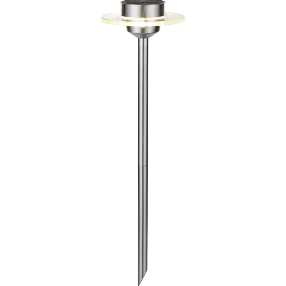 Den solcelledrevne lampen Ufo lar deg belyse hagen og hagestier på en dekorativ måte. I tillegg er den usedvanlig energibesparende, siden den kun bruker solcelleteknologi. Batteriet lades opp på dagtid (6–8 timer avhengig av solforhold) og avgir 3–5 timer med varmhvitt LED-lys. Kapslingsgraden IP44 gjør Ufo både værfast og beskyttet mot vannsprut. Utførelsen i rustfritt stål gjør denne lampen garantert rustfri. Med bryter.