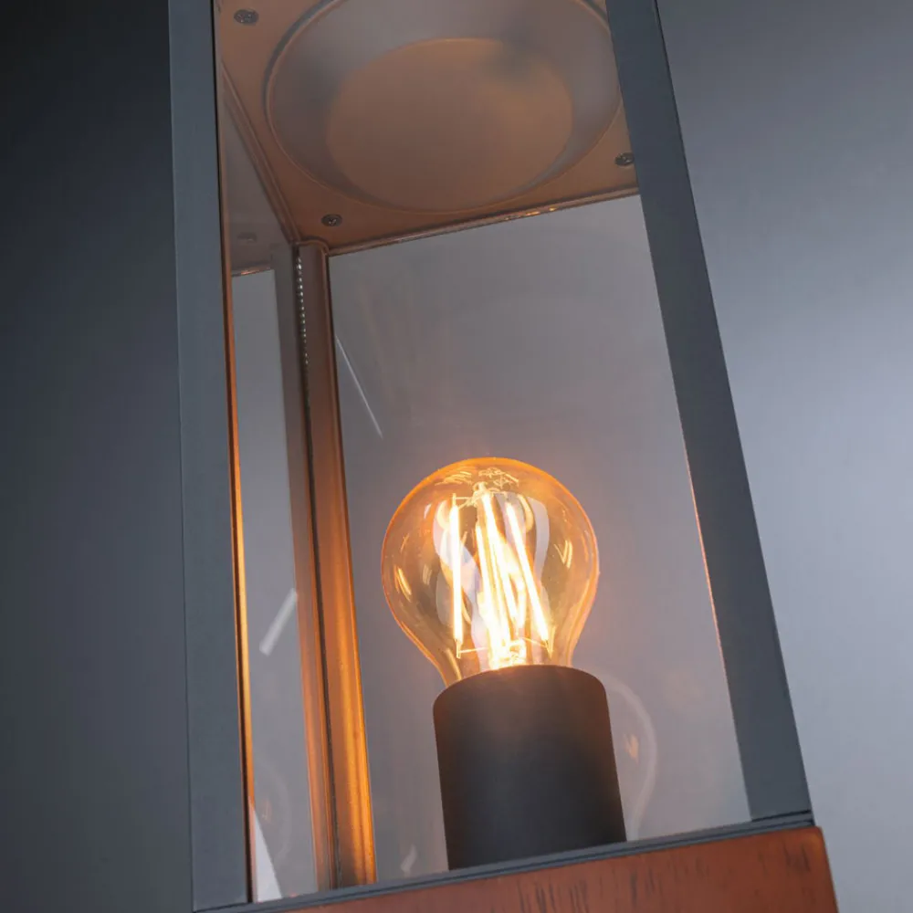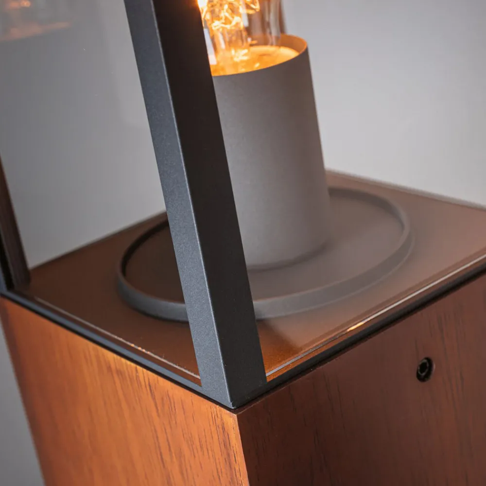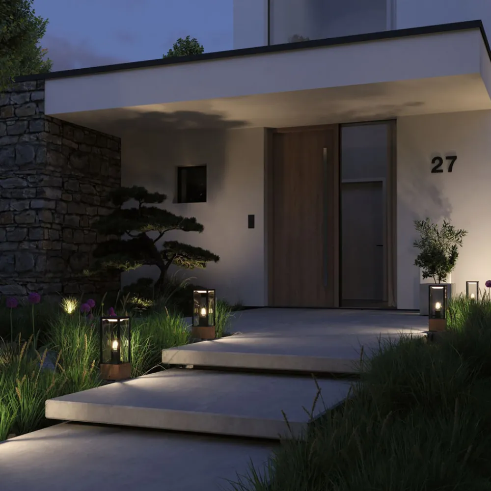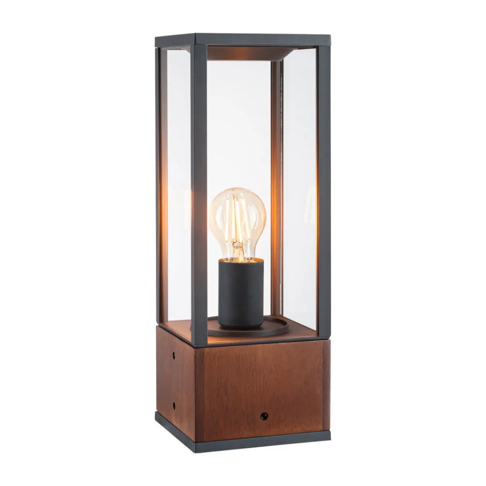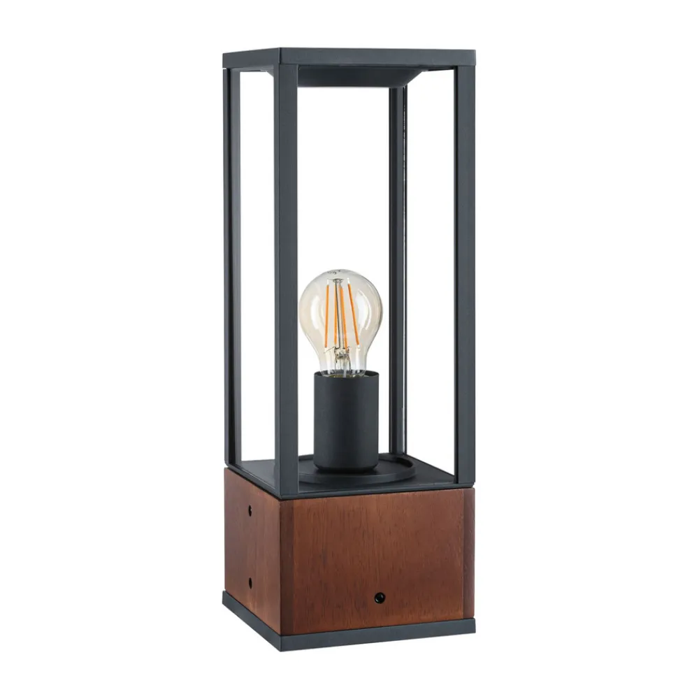 Timba sokkellys presenterer seg i form av en lineær, moderne lanterne. Den skylder sin spesielle sjarm til kombinasjonen av tre og svart metall, som danner en kantete lykt som en åpen kuboid laget av stag. I lykten ble det installert en E27-sokkel, som kan utstyres med en lyskilde etter eget valg. Lyset slippes ut på alle sider, slik at sokkellyset trygt lyser opp terrasser eller stier, samtidig som det er en vakker dekorasjon takket være den stilige designen, også når den er slått av.