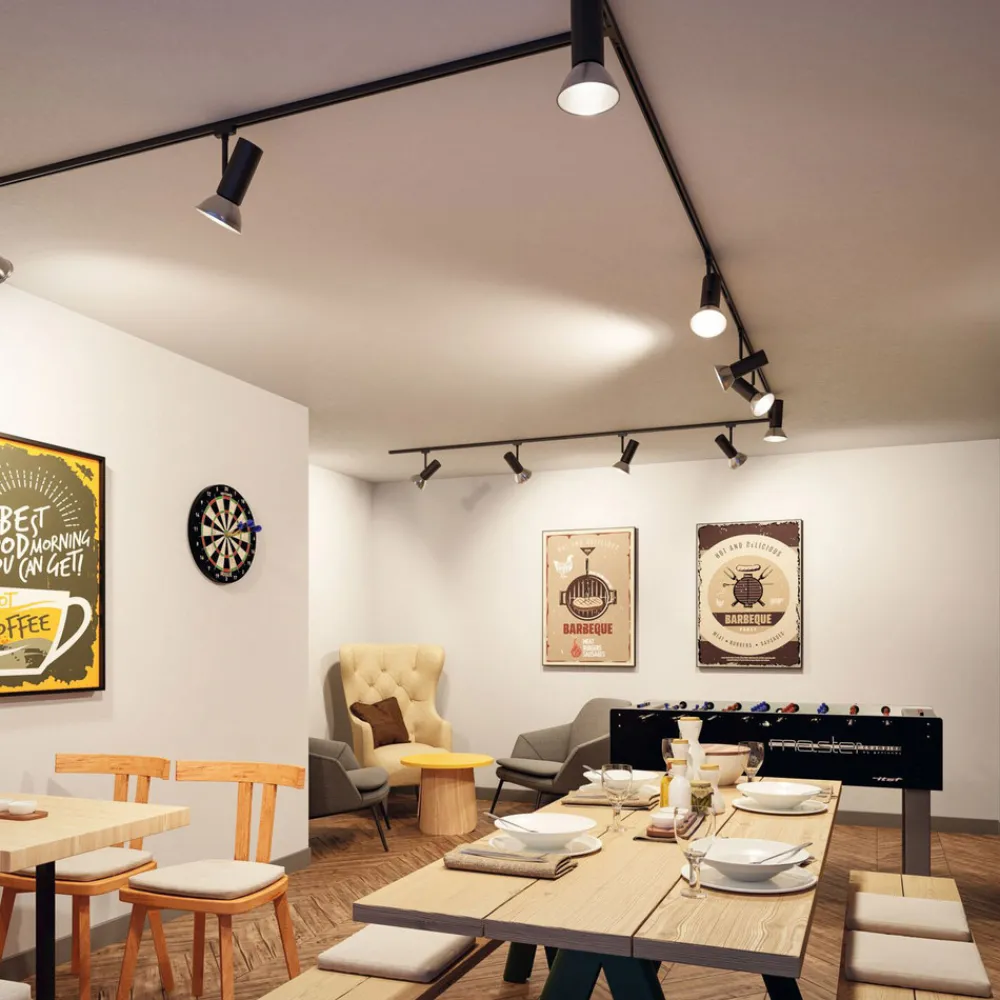 Apol URail spotlight – kan kombineres på en rekke måter takket være den enkle designen Det enkle, moderne utseendet til Apol URail spotlight for strømskinner passer lett inn i nesten alle boligstiler. Den innebygde E27-fatningen passer til alle typer pærer med passende sokkel. Egnede pærer kan kjøpes separat via tilbehøret. Lyskilden er enkel å skifte ut. En spotlight som gir omfattende omgivelsesbelysning – Kan roteres 350° – Kan svinges 80° – Kan dreies 80