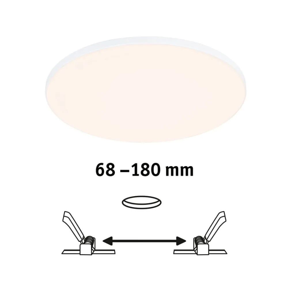 Dimbar LED-innfellingslampe Veluna Edge IP44 i rund form, 3000 K Veluna VariFit Edge er en dimbar LED-innfellingslampe med varmhvite lysdioder som også er egnet for baderom og mange andre områder takket være sprutbeskyttelsen. Lysstyrken kan reguleres via en ekstern dimmer (dimmer C for elektriske transformatorer). Takket være VariFit-teknologien med justerbare klemfjærer kan den monteres i monteringsåpninger av ulike størrelser. Den flate designen gjør det mulig å montere panelet i grunne hulrom. Det rammeløse Veluna LED-panelet har et satenert plastdeksel som sprer lyset fra lysdiodene jevnt ut i rommet – Egnet for baderom og fuktige rom takket være IP44-beskyttelse – Høyt lysutbytte med bredstrålende lys – VariFit fleksibel installasjon med justerbare klemfjærer – Dimbar med dimmer C for elektriske transformatorer